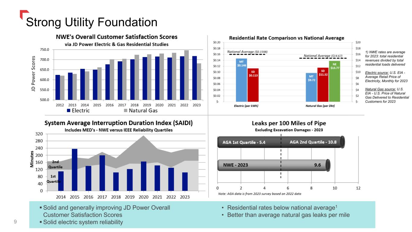 8 Highly Carbon-Free Supply Portfolio NorthWestern does not own all the renewable energy certificates (RECs) generated by contracted wind, and periodically sells its own RECs with proceeds benefiting retail customers. Accordingly, we cannot represent that 100% of carbon-free energy in the portfolio was delivered to our customers. Based upon 2023 MWH’s of owned and long-term contracted resources. Approximately 55% of our total company owned and contracted supply is carbon-free – better than the national average of ~40% in 2022. (eia.gov table 7.2b) NWE Contracted coke and waste tailings as well as a majority of the contracted wind, hydro and solar are federally mandated Qualifying Facilities, as defined under the Public Utility Regulatory Policies Act of 1978 (PURPA). MT SD 8