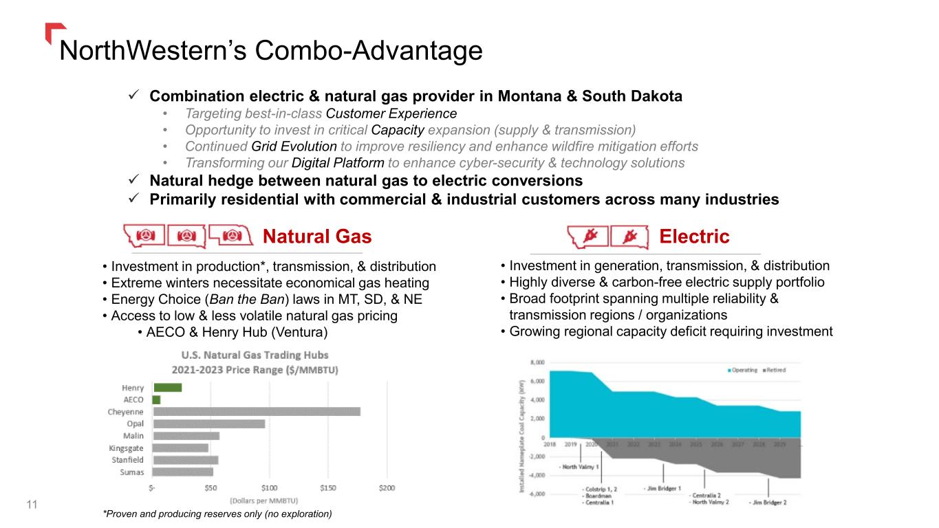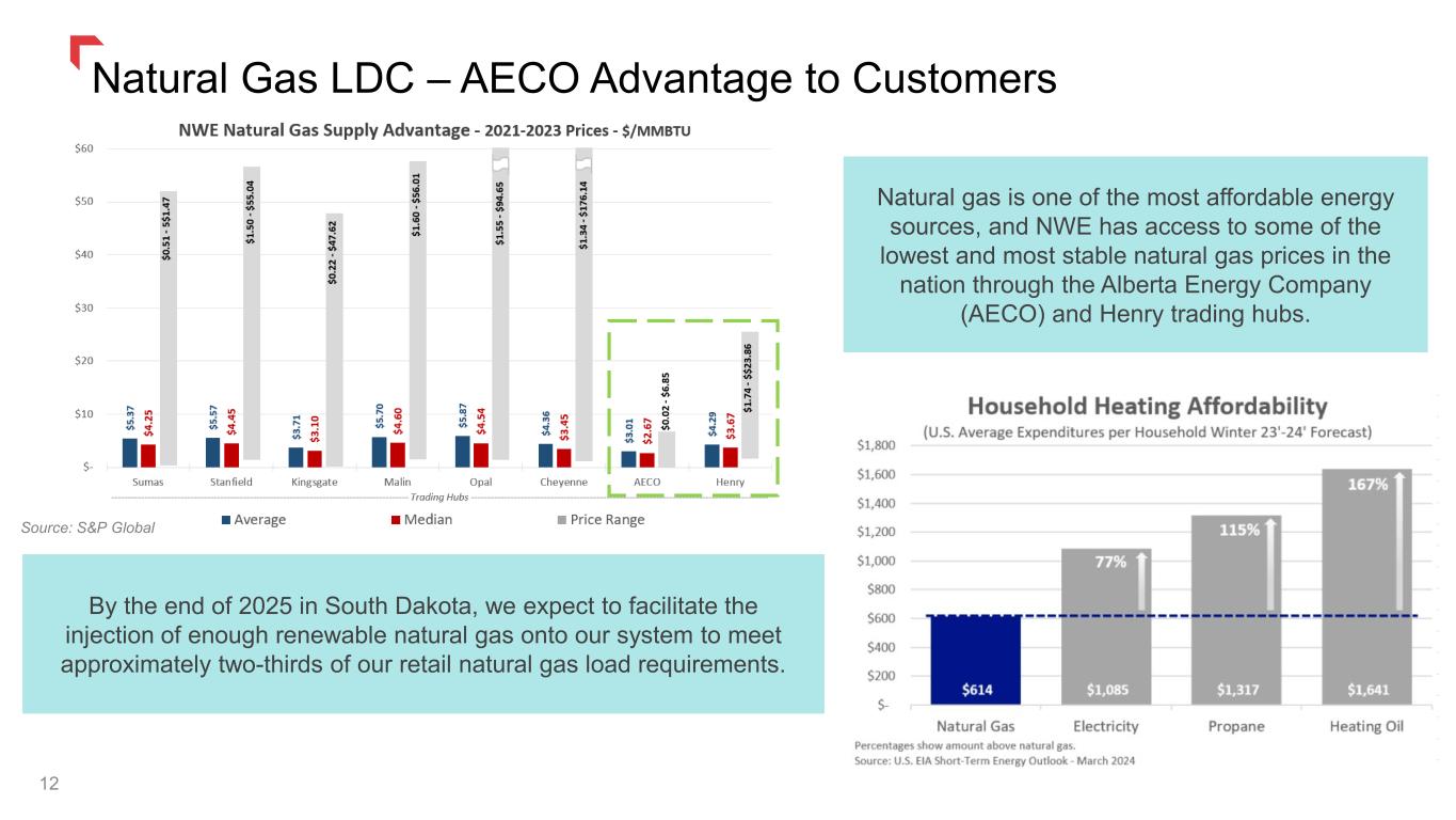 NorthWestern’s Combo-Advantage 11 Combination electric & natural gas provider in Montana & South Dakota • Targeting best-in-class Customer Experience • Opportunity to invest in critical Capacity expansion (supply & transmission) • Continued Grid Evolution to improve resiliency and enhance wildfire mitigation efforts • Transforming our Digital Platform to enhance cyber-security & technology solutions Natural hedge between natural gas to electric conversions Primarily residential with commercial & industrial customers across many industries • Investment in production*, transmission, & distribution • Extreme winters necessitate economical gas heating • Energy Choice (Ban the Ban) laws in MT, SD, & NE • Access to low & less volatile natural gas pricing • AECO & Henry Hub (Ventura) *Proven and producing reserves only (no exploration) • Investment in generation, transmission, & distribution • Highly diverse & carbon-free electric supply portfolio • Broad footprint spanning multiple reliability & transmission regions / organizations • Growing regional capacity deficit requiring investment ElectricNatural Gas