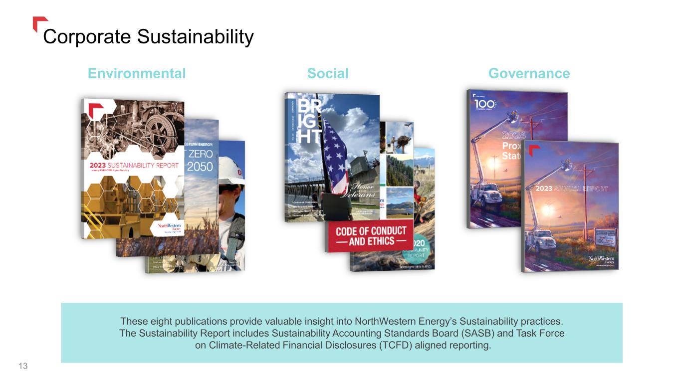 Natural Gas LDC – AECO Advantage to Customers 12 Natural gas is one of the most affordable energy sources, and NWE has access to some of the lowest and most stable natural gas prices in the nation through the Alberta Energy Company (AECO) and Henry trading hubs. Source: S&P Global By the end of 2025 in South Dakota, we expect to facilitate the injection of enough renewable natural gas onto our system to meet approximately two-thirds of our retail natural gas load requirements.