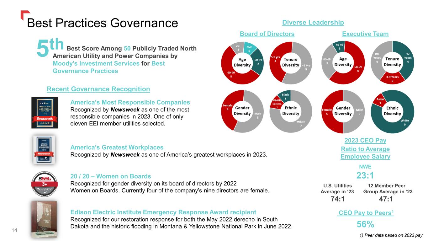 Best Practices Governance 14 America’s Most Responsible Companies Recognized by Newsweek as one of the most responsible companies in 2023. One of only eleven EEI member utilities selected. Board of Directors Executive Team 5th Best Score Among 50 Publicly Traded North American Utility and Power Companies by Moody’s Investment Services for Best Governance Practices Diverse Leadership 2023 CEO Pay Ratio to Average Employee Salary NWE 23:1 U.S. Utilities 12 Member Peer Average in ‘23 Group Average in ‘23 74:1 47:1 CEO Pay to Peers1 56% Recent Governance Recognition America’s Greatest Workplaces Recognized by Newsweek as one of America’s greatest workplaces in 2023. 20 / 20 – Women on Boards Recognized for gender diversity on its board of directors by 2022 Women on Boards. Currently four of the company’s nine directors are female. Edison Electric Institute Emergency Response Award recipient Recognized for our restoration response for both the May 2022 derecho in South Dakota and the historic flooding in Montana & Yellowstone National Park in June 2022. 1) Peer data based on 2023 pay