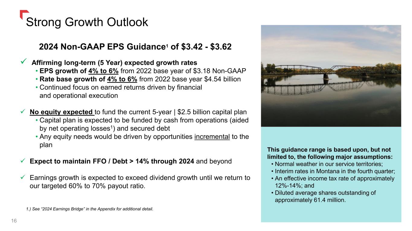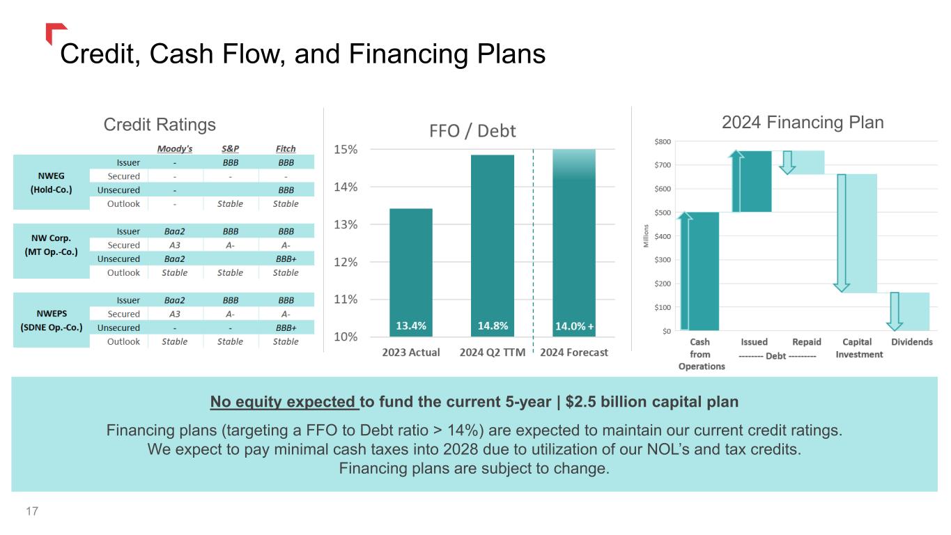 Strong Growth Outlook This guidance range is based upon, but not limited to, the following major assumptions: • Normal weather in our service territories; • Interim rates in Montana in the fourth quarter; • An effective income tax rate of approximately 12%-14%; and • Diluted average shares outstanding of approximately 61.4 million. 2024 Non-GAAP EPS Guidance1 of $3.42 - $3.62 Affirming long-term (5 Year) expected growth rates • EPS growth of 4% to 6% from 2022 base year of $3.18 Non-GAAP • Rate base growth of 4% to 6% from 2022 base year $4.54 billion • Continued focus on earned returns driven by financial and operational execution No equity expected to fund the current 5-year | $2.5 billion capital plan • Capital plan is expected to be funded by cash from operations (aided by net operating losses1) and secured debt • Any equity needs would be driven by opportunities incremental to the plan Expect to maintain FFO / Debt > 14% through 2024 and beyond Earnings growth is expected to exceed dividend growth until we return to our targeted 60% to 70% payout ratio. 16 1.) See “2024 Earnings Bridge” in the Appendix for additional detail.