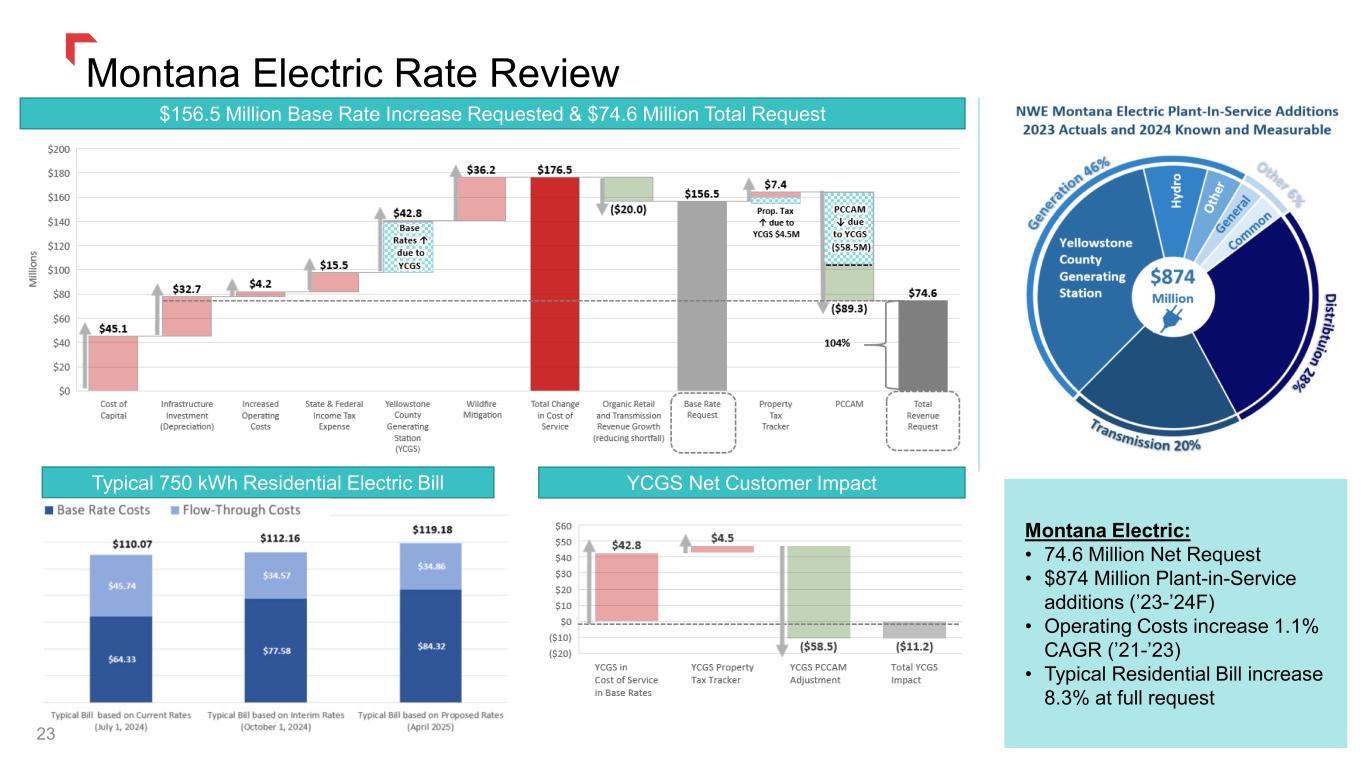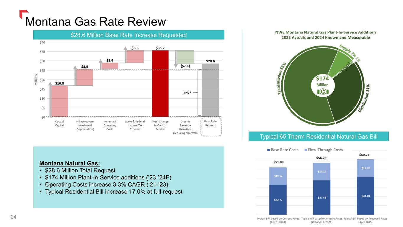 Montana Electric Rate Review Montana Electric: • 74.6 Million Net Request • $874 Million Plant-in-Service additions (’23-’24F) • Operating Costs increase 1.1% CAGR (’21-’23) • Typical Residential Bill increase 8.3% at full request 23 $156.5 Million Base Rate Increase Requested & $74.6 Million Total Request Typical 750 kWh Residential Electric Bill YCGS Net Customer Impact