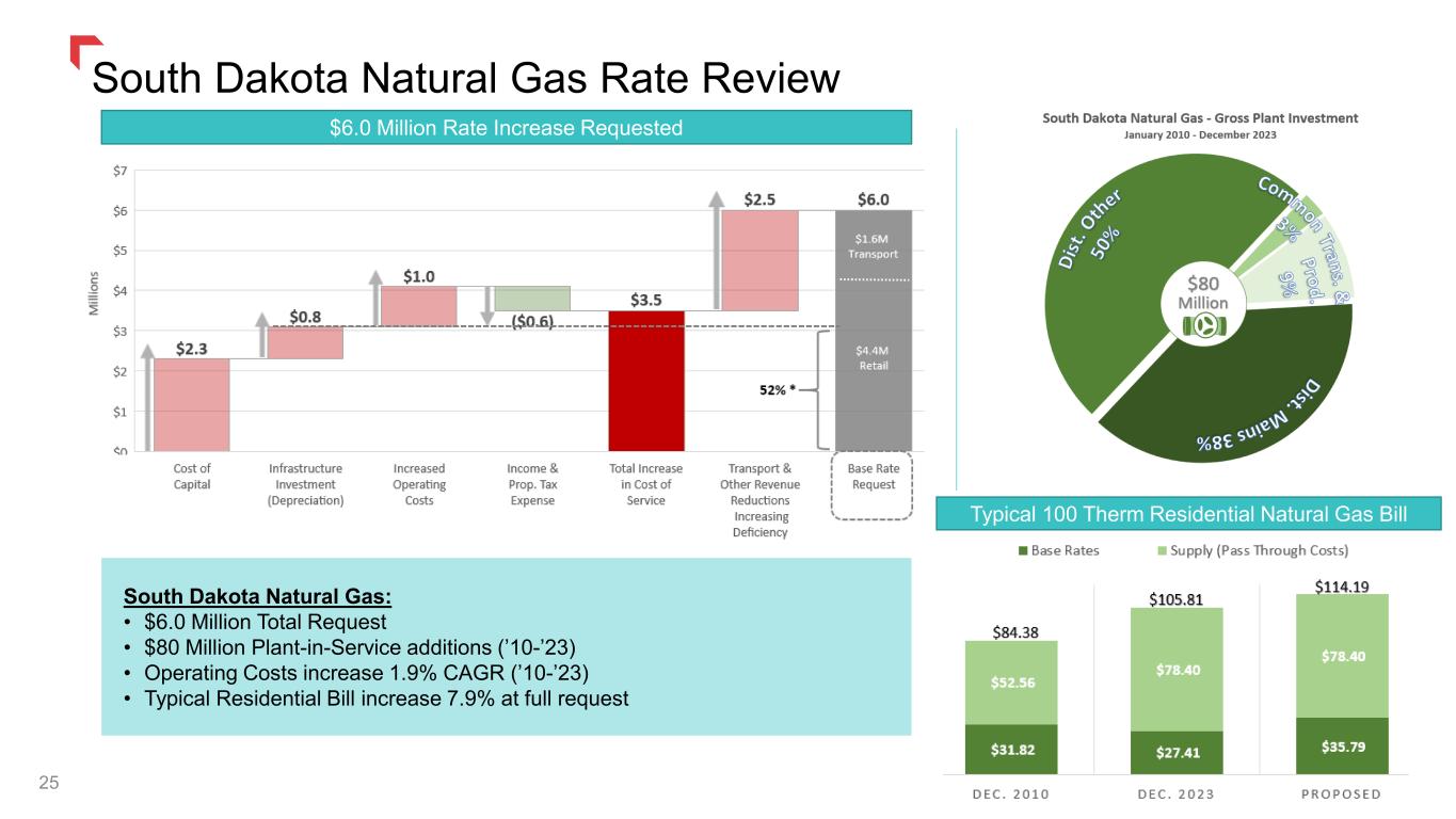 Montana Gas Rate Review 24 $28.6 Million Base Rate Increase Requested Montana Natural Gas: • $28.6 Million Total Request • $174 Million Plant-in-Service additions (’23-’24F) • Operating Costs increase 3.3% CAGR (’21-’23) • Typical Residential Bill increase 17.0% at full request Typical 65 Therm Residential Natural Gas Bill