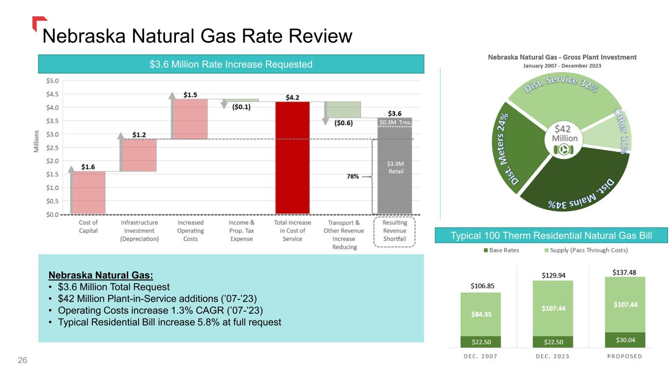 South Dakota Natural Gas Rate Review 25 South Dakota Natural Gas: • $6.0 Million Total Request • $80 Million Plant-in-Service additions (’10-’23) • Operating Costs increase 1.9% CAGR (’10-’23) • Typical Residential Bill increase 7.9% at full request $6.0 Million Rate Increase Requested Typical 100 Therm Residential Natural Gas Bill