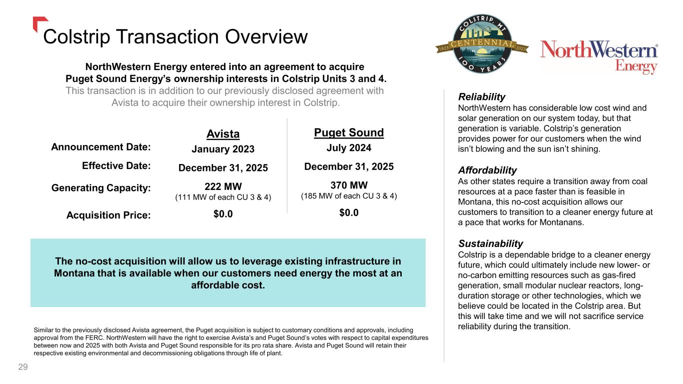 Energy West / Cut Bank Natural Gas Acquisition 28 Transaction Highlights Purchase Price Approvals and Timing • Two natural gas LDC’s in Montana: Energy West Montana (“EWM”) and Cut Bank Gas Co. (“CBGC”) from Hope Utilities • 33,000 customers in Great Falls area, West Yellowstone and Cut Bank communities • EWM’s and CBGC’s currently authorized rates will remain until our next natural gas rate review • Asset purchase price of $39 million*, subject to a number of customary closing conditions • Expected closing in the first quarter of 2025 • Subject to Montana Public Service Commission approval (August 2024 filing) • Opportunity to acquire assets strategically located within our service territory • Consistent with focus on our existing regulated utility business Customers • Expands and reinforces NorthWestern’s commitment to Montana, its communities and residents • Opportunity to expand NorthWestern’s charitable and economic development impact Communities • EWM and CBGC employees offered employment with NWE • NorthWestern remains committed to competitive pay, benefits and opportunity for advancement Employees • Regulated distribution assets within our existing geography • Expected to be earnings and credit neutralInvestors * Approximately 1.5x estimated 2024 ending Property Plant & Equipment balance