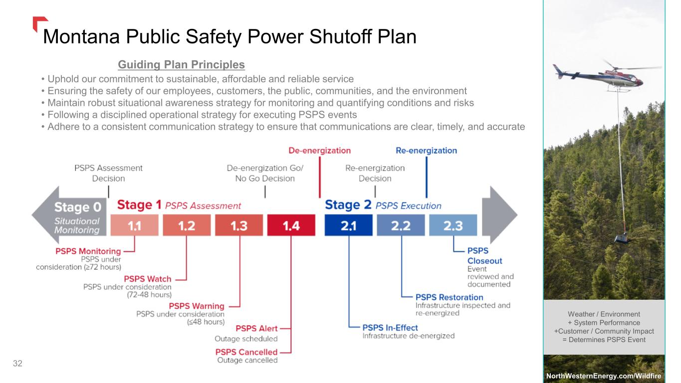 Montana Wildfire Mitigation Plan 31 Reduction of Ignition Potential System and Environmental Monitoring Enhanced Vegetation Maintenance Enriched Public Communication and Outreach Comprehensive summary of wildfire mitigation activities Expect to update plan with each electric rate review filing Deferral treatment for wildfire costs beyond amounts authorized in rates (up to $95 million over 5 years) Key elements of the plan, driven by risk analysis include: • Situational Awareness • Operational Practice • System Preparedness Our operational practice includes situationally performing power shutdowns and adjusting system operating protocols during periods of heightened wildfire risk. Power shutdown considerations include environmental conditions, system performance, and mitigating any potential impacts of an outage to customers and emergency services. • Vegetation Management • Public Communication Distribution 5.9% Transmission 7.3% Linear line miles of highest risk Montana electric assets NorthWesternEnergy.com/Wildfire