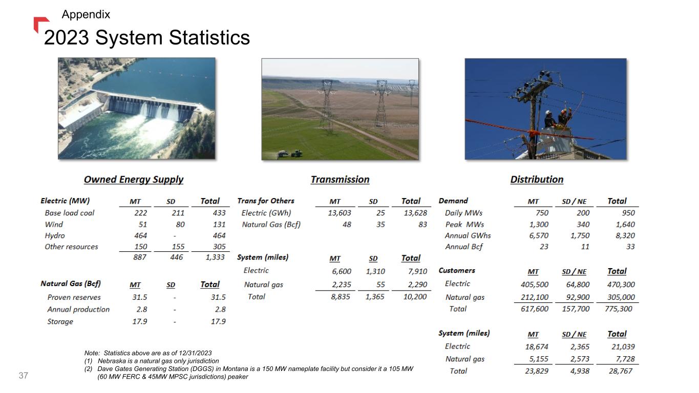 (1) The revenue requirement associated with the FERC regulated portion of Montana electric transmission and ancillary services are included as revenue credits to our MPSC jurisdictional customers. Therefore, we do not separately reflect FERC authorized rate base or authorized returns. (2) The Montana gas revenue requirement includes a step down which approximates annual depletion of our natural gas production assets included in rate base. (3) For those items marked as "n/a," the respective settlement and/or order was not specific as to these terms. (4) On June 15, 2023, we filed a South Dakota electric rate review filing (2022 test year) with the South Dakota Public Utility Commission Coal Generation Rate Base as a percentage of Total Rate Base Revenue from coal generation is not easily identifiable due to the use of bundled rates in South Dakota and other rate design and accounting considerations. However, NorthWestern is a fully regulated utility company for which rate base is the primary driver for earnings. The data to the left illustrates that NorthWestern only derives approximately 8 -10% of earnings from its jointly owned coal generation rate base. Rate Base & Authorized Return Summary Appendix 36