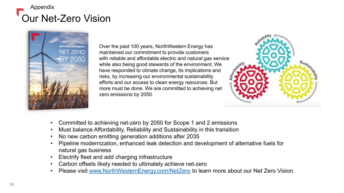 Our Net-Zero Vision Over the past 100 years, NorthWestern Energy has maintained our commitment to provide customers with reliable and affordable electric and natural gas service while also being good stewards of the environment. We have responded to climate change, its implications and risks, by increasing our environmental sustainability efforts and our access to clean energy resources. But more must be done. We are committed to achieving net zero emissions by 2050. • Committed to achieving net-zero by 2050 for Scope 1 and 2 emissions • Must balance Affordability, Reliability and Sustainability in this transition • No new carbon emitting generation additions after 2035 • Pipeline modernization, enhanced leak detection and development of alternative fuels for natural gas business • Electrify fleet and add charging infrastructure • Carbon offsets likely needed to ultimately achieve net-zero • Please visit www.NorthWesternEnergy.com/NetZero to learn more about our Net Zero Vision. 39 Appendix