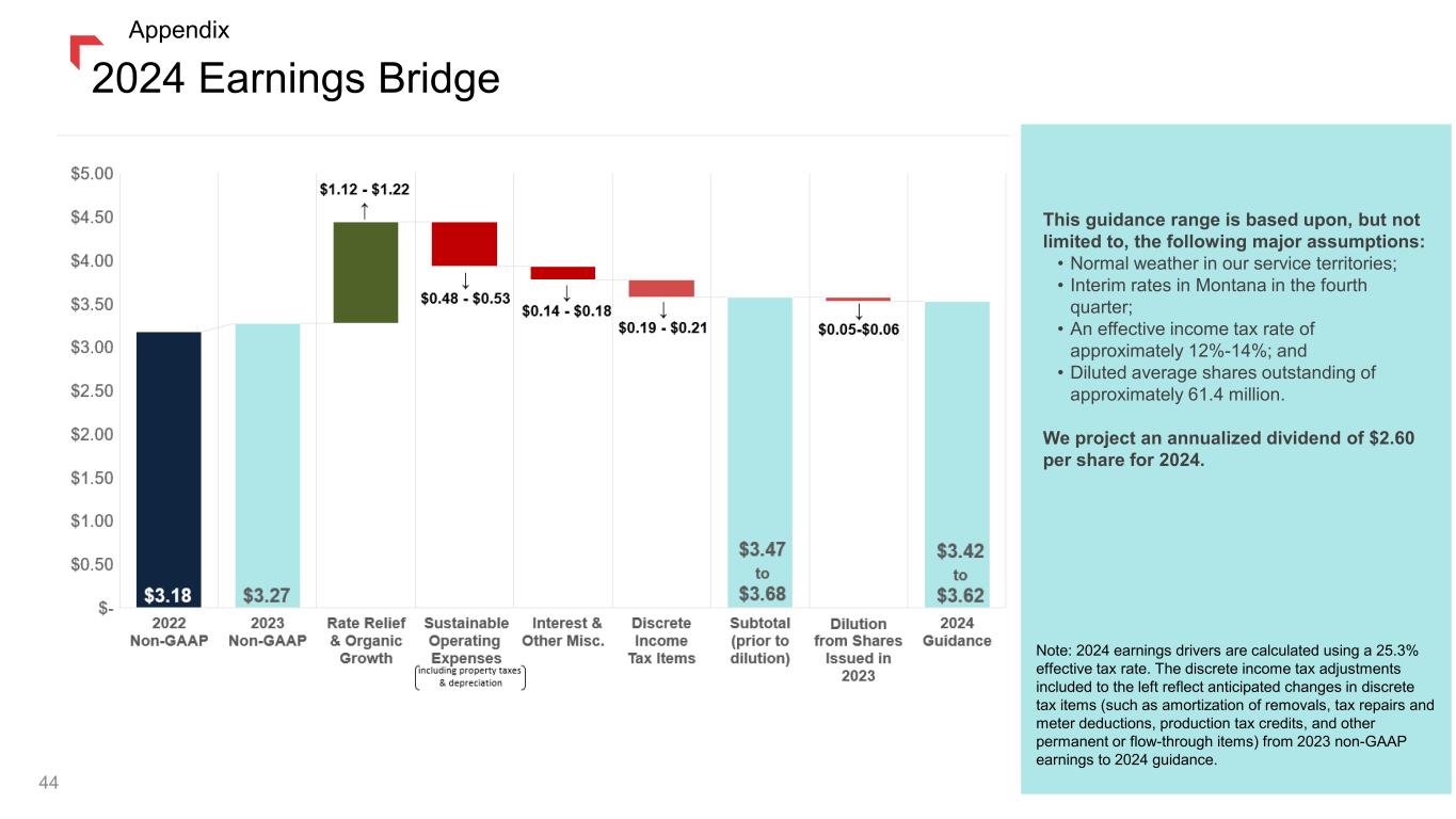 2024 Earnings Bridge This guidance range is based upon, but not limited to, the following major assumptions: • Normal weather in our service territories; • Interim rates in Montana in the fourth quarter; • An effective income tax rate of approximately 12%-14%; and • Diluted average shares outstanding of approximately 61.4 million. We project an annualized dividend of $2.60 per share for 2024. 44 Note: 2024 earnings drivers are calculated using a 25.3% effective tax rate. The discrete income tax adjustments included to the left reflect anticipated changes in discrete tax items (such as amortization of removals, tax repairs and meter deductions, production tax credits, and other permanent or flow-through items) from 2023 non-GAAP earnings to 2024 guidance. Appendix