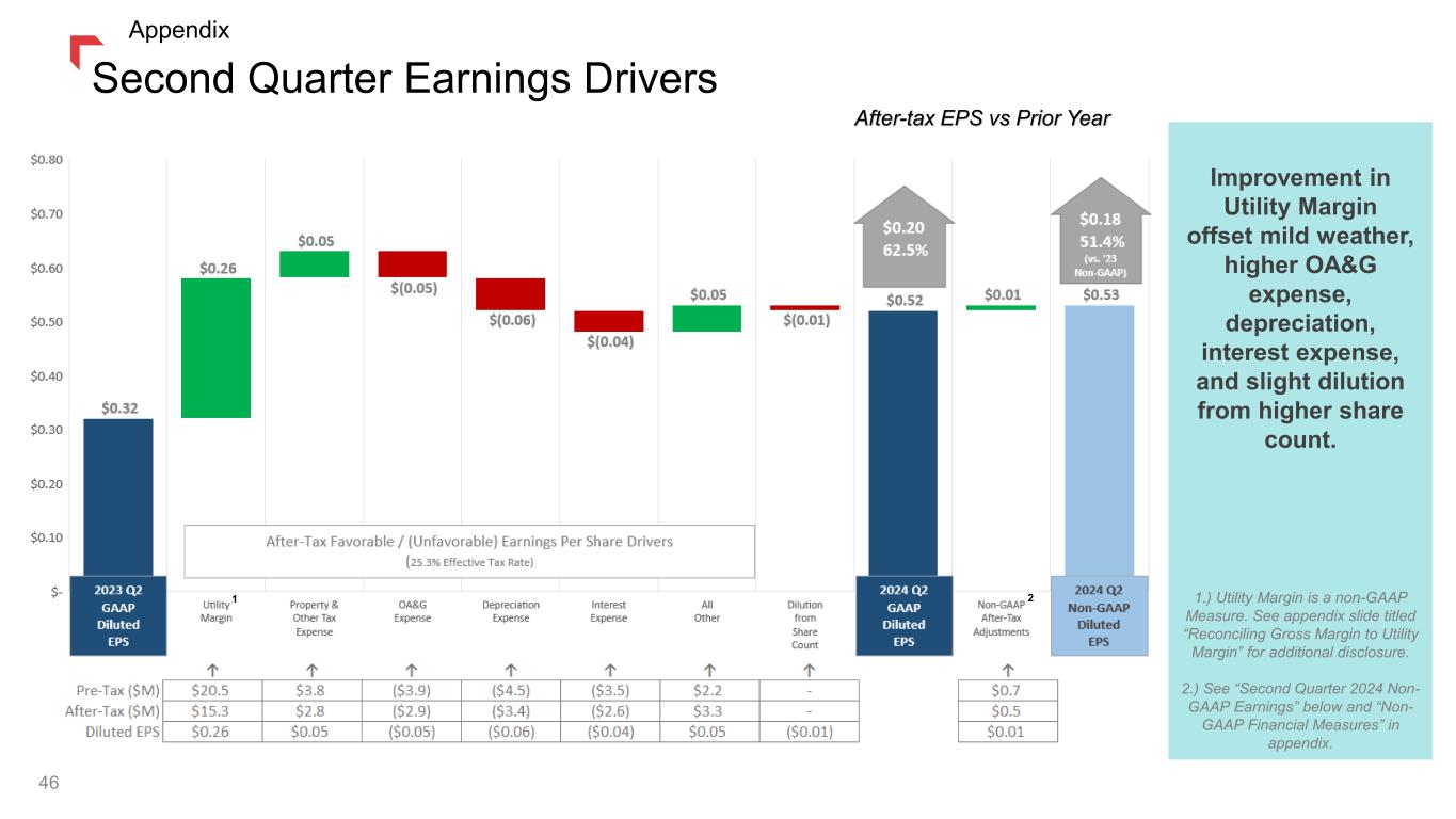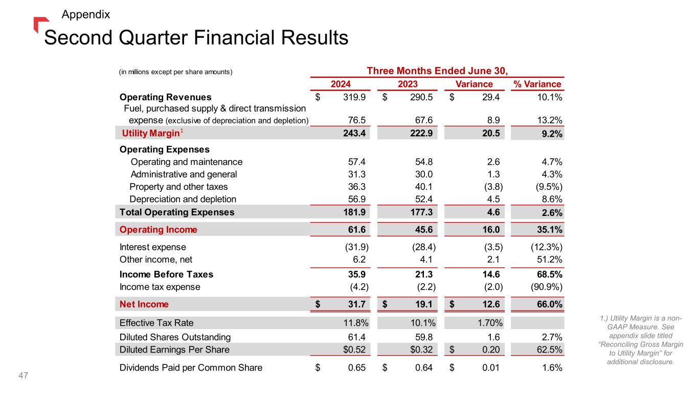 After-tax EPS vs Prior Year Second Quarter Earnings Drivers 46 1 2 Improvement in Utility Margin offset mild weather, higher OA&G expense, depreciation, interest expense, and slight dilution from higher share count. 1.) Utility Margin is a non-GAAP Measure. See appendix slide titled “Reconciling Gross Margin to Utility Margin” for additional disclosure. 2.) See “Second Quarter 2024 Non- GAAP Earnings” below and “Non- GAAP Financial Measures” in appendix. Appendix