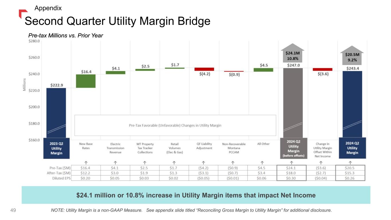 We estimate weather to be a $0.7 million pre-tax detriment as compared to normal and a $1.1 million benefit as compared to second quarter 2023. (1) As a result of the adoption of Accounting Standard Update 2017-07 in March 2018, pension and other employee benefit expense is now disaggregated on the GAAP income statement with portions now recorded in both OG&A expense and Other (Expense) Income lines. To facilitate better understanding of trends in year-over-year comparisons, the non-GAAP adjustment above re-aggregates the expense in OG&A - as it was historically presented prior to the ASU 2017-07 (with no impact to net income or earnings per share). (2) Utility Margin is a non-GAAP Measure. See the slide titled “Reconciling Gross Margin to Utility Margin” for additional disclosures. Second Quarter 2024 Non-GAAP Earnings 48 The adjusted non-GAAP measures presented in the table reflect significant items that are non-recurring or a variance from normal weather, however they should not be considered a substitute for financial results and measures determined or calculated in accordance with GAAP. Appendix