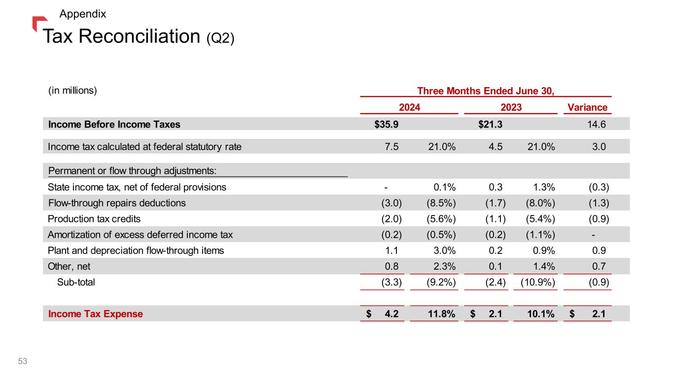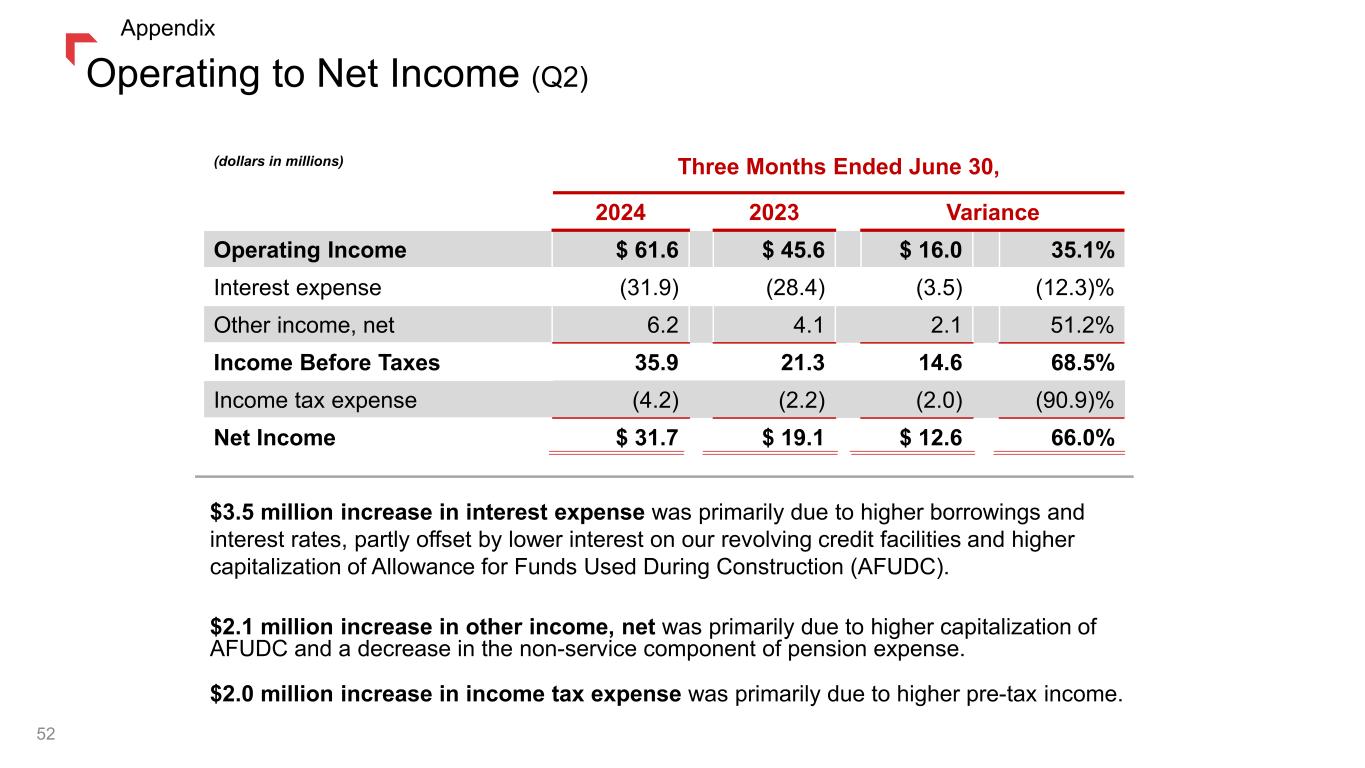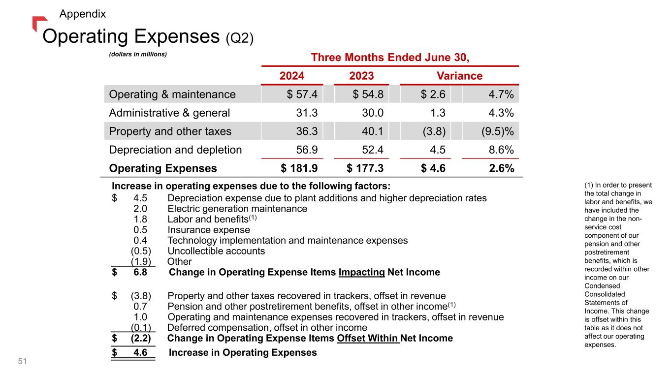 Operating Expenses (Q2) Increase in operating expenses due to the following factors: $ 4.5 Depreciation expense due to plant additions and higher depreciation rates 2.0 Electric generation maintenance 1.8 Labor and benefits(1) 0.5 Insurance expense 0.4 Technology implementation and maintenance expenses (0.5) Uncollectible accounts (1.9) Other $ 6.8 Change in Operating Expense Items Impacting Net Income (dollars in millions) Three Months Ended June 30, 2024 2023 Variance Operating & maintenance $ 57.4 $ 54.8 $ 2.6 4.7% Administrative & general 31.3 30.0 1.3 4.3% Property and other taxes 36.3 40.1 (3.8) (9.5)% Depreciation and depletion 56.9 52.4 4.5 8.6% Operating Expenses $ 181.9 $ 177.3 $ 4.6 2.6% $ (3.8) Property and other taxes recovered in trackers, offset in revenue 0.7 Pension and other postretirement benefits, offset in other income(1) 1.0 Operating and maintenance expenses recovered in trackers, offset in revenue (0.1) Deferred compensation, offset in other income $ (2.2) Change in Operating Expense Items Offset Within Net Income $ 4.6 Increase in Operating Expenses (1) In order to present the total change in labor and benefits, we have included the change in the non- service cost component of our pension and other postretirement benefits, which is recorded within other income on our Condensed Consolidated Statements of Income. This change is offset within this table as it does not affect our operating expenses. 51 Appendix