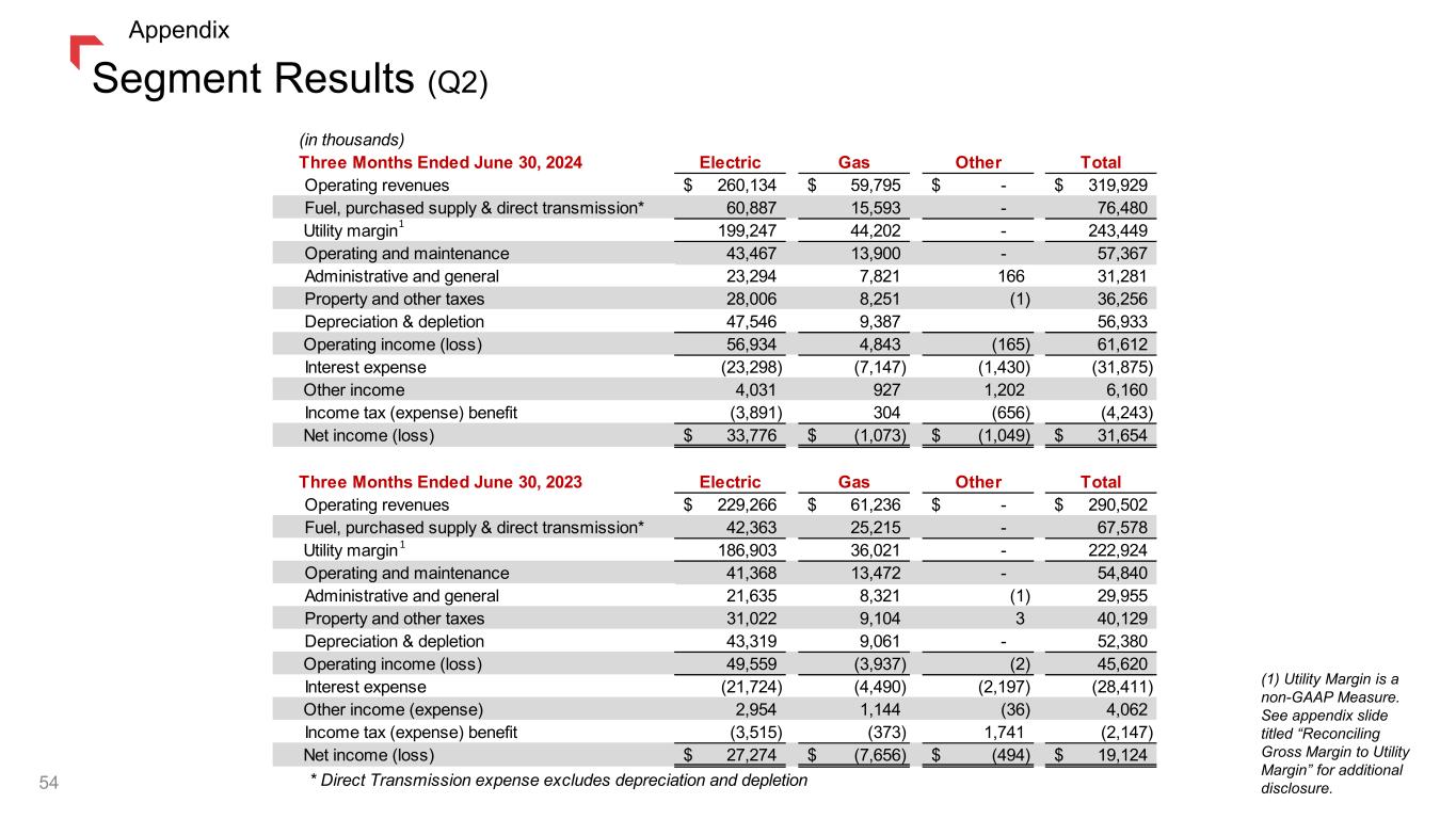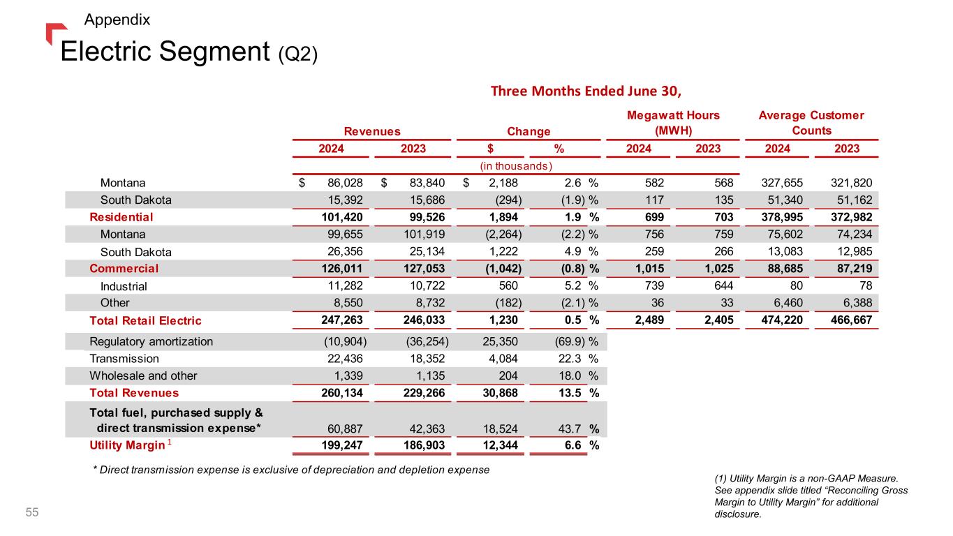 Segment Results (Q2) (1) Utility Margin is a non-GAAP Measure. See appendix slide titled “Reconciling Gross Margin to Utility Margin” for additional disclosure. 54 Appendix Three Months Ended June 30, 2024 Electric Gas Other Total Operating revenues 260,134$ 59,795$ -$ 319,929$ Fuel, purchased supply & direct transmission* 60,887 15,593 - 76,480 Utility margin 199,247 44,202 - 243,449 Operating and maintenance 43,467 13,900 - 57,367 Administrative and general 23,294 7,821 166 31,281 Property and other taxes 28,006 8,251 (1) 36,256 Depreciation & depletion 47,546 9,387 56,933 Operating income (loss) 56,934 4,843 (165) 61,612 Interest expense (23,298) (7,147) (1,430) (31,875) Other income 4,031 927 1,202 6,160 Income tax (expense) benefit (3,891) 304 (656) (4,243) Net income (loss) 33,776$ (1,073)$ (1,049)$ 31,654$ Three Months Ended June 30, 2023 Electric Gas Other Total Operating revenues 229,266$ 61,236$ -$ 290,502$ Fuel, purchased supply & direct transmission* 42,363 25,215 - 67,578 Utility margin 186,903 36,021 - 222,924 Operating and maintenance 41,368 13,472 - 54,840 Administrative and general 21,635 8,321 (1) 29,955 Property and other taxes 31,022 9,104 3 40,129 Depreciation & depletion 43,319 9,061 - 52,380 Operating income (loss) 49,559 (3,937) (2) 45,620 Interest expense (21,724) (4,490) (2,197) (28,411) Other income (expense) 2,954 1,144 (36) 4,062 Income tax (expense) benefit (3,515) (373) 1,741 (2,147) Net income (loss) 27,274$ (7,656)$ (494)$ 19,124$ * Direct Transmission expense excludes depreciation and depletion (in thousands) 1 1
