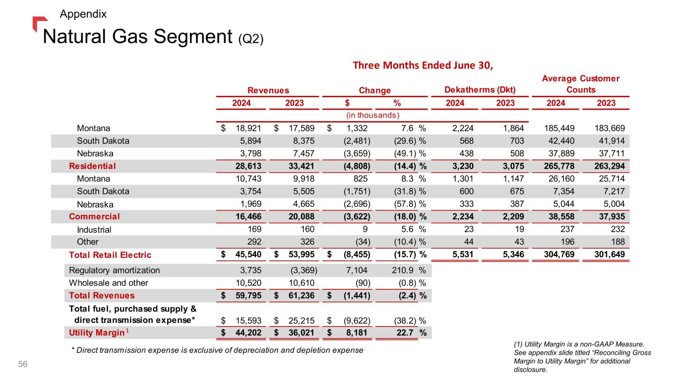 2024 2023 $ % 2024 2023 2024 2023 Montana 86,028$ 83,840$ 2,188$ 2.6 % 582 568 327,655 321,820 South Dakota 15,392 15,686 (294) (1.9) % 117 135 51,340 51,162 Residential 101,420 99,526 1,894 1.9 % 699 703 378,995 372,982 Montana 99,655 101,919 (2,264) (2.2) % 756 759 75,602 74,234 South Dakota 26,356 25,134 1,222 4.9 % 259 266 13,083 12,985 Commercial 126,011 127,053 (1,042) (0.8) % 1,015 1,025 88,685 87,219 Industrial 11,282 10,722 560 5.2 % 739 644 80 78 Other 8,550 8,732 (182) (2.1) % 36 33 6,460 6,388 Total Retail Electric 247,263 246,033 1,230 0.5 % 2,489 2,405 474,220 466,667 Regulatory amortization (10,904) (36,254) 25,350 (69.9) % Transmission 22,436 18,352 4,084 22.3 % Wholesale and other 1,339 1,135 204 18.0 % Total Revenues 260,134 229,266 30,868 13.5 % Total fuel, purchased supply & direct transmission expense* 60,887 42,363 18,524 43.7 % Utility Margin 199,247 186,903 12,344 6.6 % * Direct transmission expense is exclusive of depreciation and depletion expense (in thousands) Megawatt Hours (MWH) Average Customer CountsChange Three Months Ended June 30, Revenues 1 Electric Segment (Q2) (1) Utility Margin is a non-GAAP Measure. See appendix slide titled “Reconciling Gross Margin to Utility Margin” for additional disclosure. 55 Appendix