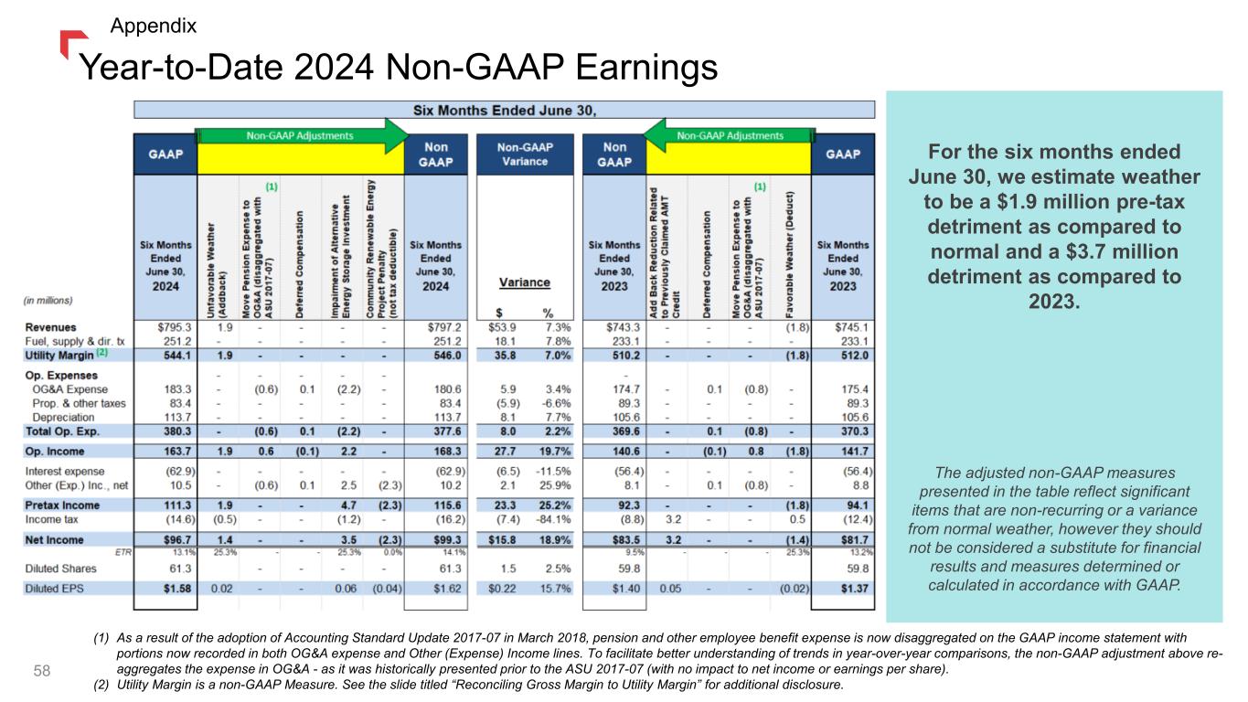 (1) As a result of the adoption of Accounting Standard Update 2017-07 in March 2018, pension and other employee benefit expense is now disaggregated on the GAAP income statement with portions now recorded in both OG&A expense and Other (Expense) Income lines. To facilitate better understanding of trends in year-over-year comparisons, the non-GAAP adjustment above re- aggregates the expense in OG&A - as it was historically presented prior to the ASU 2017-07 (with no impact to net income or earnings per share). (2) Utility Margin is a non-GAAP Measure. See the slide titled “Reconciling Gross Margin to Utility Margin” for additional disclosure. Year-to-Date 2024 Non-GAAP Earnings 58 For the six months ended June 30, we estimate weather to be a $1.9 million pre-tax detriment as compared to normal and a $3.7 million detriment as compared to 2023. The adjusted non-GAAP measures presented in the table reflect significant items that are non-recurring or a variance from normal weather, however they should not be considered a substitute for financial results and measures determined or calculated in accordance with GAAP. Appendix