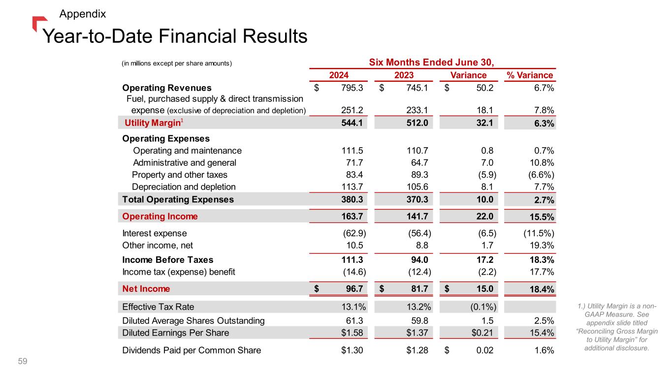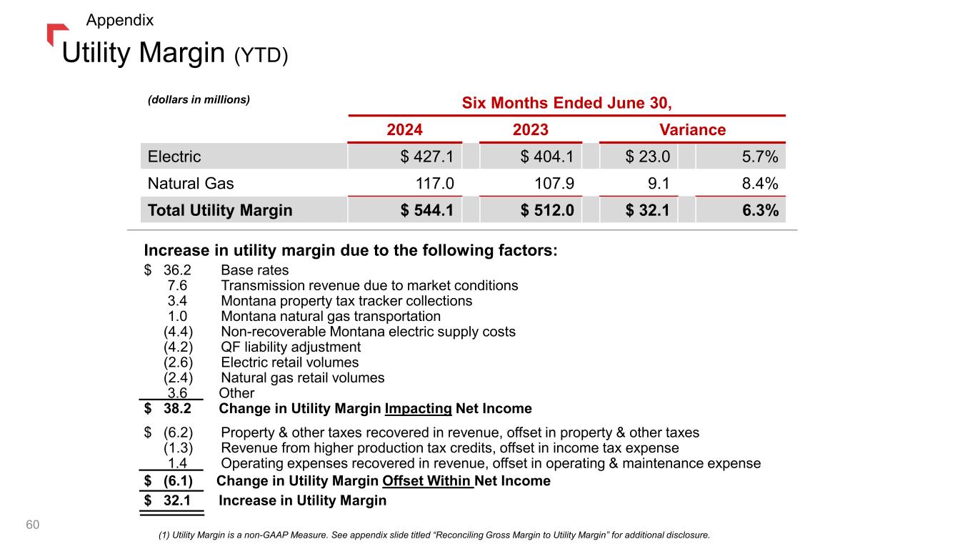 (in millions except per share amounts) 2024 2023 Variance % Variance Operating Revenues 795.3$ 745.1$ 50.2$ 6.7% 251.2 233.1 18.1 7.8% Utility Margin 544.1 512.0 32.1 6.3% Operating Expenses Operating and maintenance 111.5 110.7 0.8 0.7% Administrative and general 71.7 64.7 7.0 10.8% Property and other taxes 83.4 89.3 (5.9) (6.6%) Depreciation and depletion 113.7 105.6 8.1 7.7% Total Operating Expenses 380.3 370.3 10.0 2.7% Operating Income 163.7 141.7 22.0 15.5% Interest expense (62.9) (56.4) (6.5) (11.5%) Other income, net 10.5 8.8 1.7 19.3% Income Before Taxes 111.3 94.0 17.2 18.3% Income tax (expense) benefit (14.6) (12.4) (2.2) 17.7% Net Income 96.7$ 81.7$ 15.0$ 18.4% Effective Tax Rate 13.1% 13.2% (0.1%) Diluted Average Shares Outstanding 61.3 59.8 1.5 2.5% Diluted Earnings Per Share $1.58 $1.37 $0.21 15.4% Dividends Paid per Common Share $1.30 $1.28 0.02$ 1.6% Six Months Ended June 30, Fuel, purchased supply & direct transmission expense (exclusive of depreciation and depletion) 1 Year-to-Date Financial Results 59 1.) Utility Margin is a non- GAAP Measure. See appendix slide titled “Reconciling Gross Margin to Utility Margin” for additional disclosure. Appendix