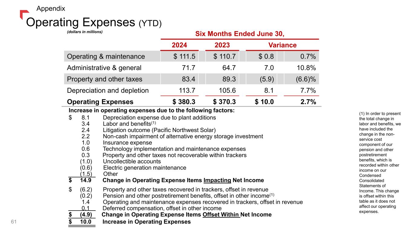 (dollars in millions) Six Months Ended June 30, 2024 2023 Variance Operating & maintenance $ 111.5 $ 110.7 $ 0.8 0.7% Administrative & general 71.7 64.7 7.0 10.8% Property and other taxes 83.4 89.3 (5.9) (6.6)% Depreciation and depletion 113.7 105.6 8.1 7.7% Operating Expenses $ 380.3 $ 370.3 $ 10.0 2.7% Increase in operating expenses due to the following factors: $ 8.1 Depreciation expense due to plant additions 3.4 Labor and benefits(1) 2.4 Litigation outcome (Pacific Northwest Solar) 2.2 Non-cash impairment of alternative energy storage investment 1.0 Insurance expense 0.6 Technology implementation and maintenance expenses 0.3 Property and other taxes not recoverable within trackers (1.0) Uncollectible accounts (0.6) Electric generation maintenance (1.5) Other $ 14.9 Change in Operating Expense Items Impacting Net Income $ (6.2) Property and other taxes recovered in trackers, offset in revenue (0.2) Pension and other postretirement benefits, offset in other income(1) 1.4 Operating and maintenance expenses recovered in trackers, offset in revenue 0.1 Deferred compensation, offset in other income $ (4.9) Change in Operating Expense Items Offset Within Net Income $ 10.0 Increase in Operating Expenses Operating Expenses (YTD) (1) In order to present the total change in labor and benefits, we have included the change in the non- service cost component of our pension and other postretirement benefits, which is recorded within other income on our Condensed Consolidated Statements of Income. This change is offset within this table as it does not affect our operating expenses. 61 Appendix