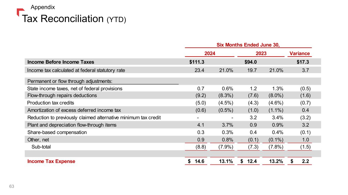 Tax Reconciliation (YTD) 63 Appendix Variance Income Before Income Taxes $111.3 $94.0 $17.3 Income tax calculated at federal statutory rate 23.4 21.0% 19.7 21.0% 3.7 Permanent or flow through adjustments: State income taxes, net of federal provisions 0.7 0.6% 1.2 1.3% (0.5) Flow-through repairs deductions (9.2) (8.3%) (7.6) (8.0%) (1.6) Production tax credits (5.0) (4.5%) (4.3) (4.6%) (0.7) Amortization of excess deferred income tax (0.6) (0.5%) (1.0) (1.1%) 0.4 Reduction to previously claimed alternative minimum tax credit - - 3.2 3.4% (3.2) Plant and depreciation flow-through items 4.1 3.7% 0.9 0.9% 3.2 Share-based compensation 0.3 0.3% 0.4 0.4% (0.1) Other, net 0.9 0.8% (0.1) (0.1%) 1.0 Sub-total (8.8) (7.9%) (7.3) (7.8%) (1.5) Income Tax Expense 14.6$ 13.1% 12.4$ 13.2% 2.2$ 2024 2023 Six Months Ended June 30,