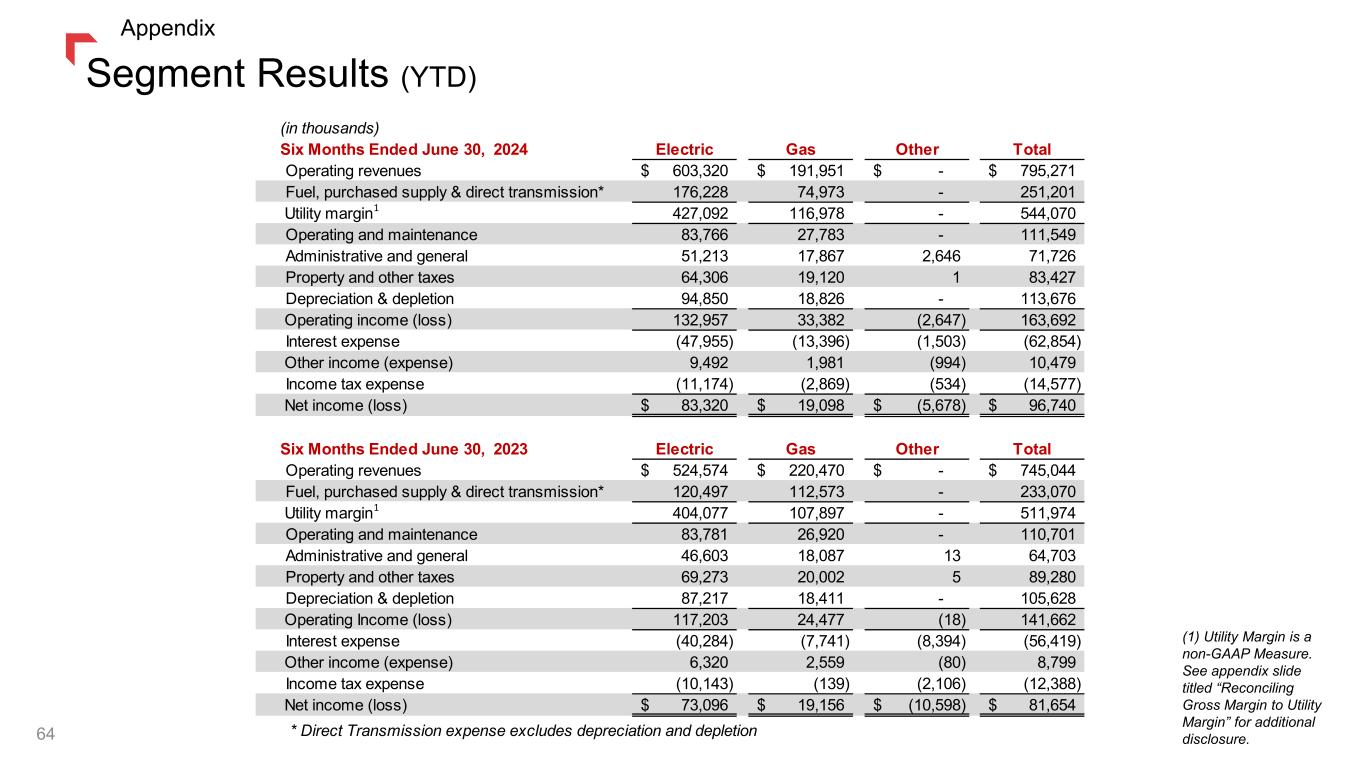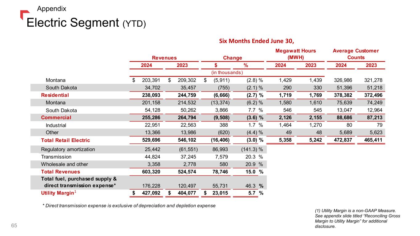 Segment Results (YTD) (1) Utility Margin is a non-GAAP Measure. See appendix slide titled “Reconciling Gross Margin to Utility Margin” for additional disclosure. 64 Appendix Six Months Ended June 30, 2024 Electric Gas Other Total Operating revenues 603,320$ 191,951$ -$ 795,271$ Fuel, purchased supply & direct transmission* 176,228 74,973 - 251,201 Utility margin 427,092 116,978 - 544,070 Operating and maintenance 83,766 27,783 - 111,549 Administrative and general 51,213 17,867 2,646 71,726 Property and other taxes 64,306 19,120 1 83,427 Depreciation & depletion 94,850 18,826 - 113,676 Operating income (loss) 132,957 33,382 (2,647) 163,692 Interest expense (47,955) (13,396) (1,503) (62,854) Other income (expense) 9,492 1,981 (994) 10,479 Income tax expense (11,174) (2,869) (534) (14,577) Net income (loss) 83,320$ 19,098$ (5,678)$ 96,740$ Six Months Ended June 30, 2023 Electric Gas Other Total Operating revenues 524,574$ 220,470$ -$ 745,044$ Fuel, purchased supply & direct transmission* 120,497 112,573 - 233,070 Utility margin 404,077 107,897 - 511,974 Operating and maintenance 83,781 26,920 - 110,701 Administrative and general 46,603 18,087 13 64,703 Property and other taxes 69,273 20,002 5 89,280 Depreciation & depletion 87,217 18,411 - 105,628 Operating Income (loss) 117,203 24,477 (18) 141,662 Interest expense (40,284) (7,741) (8,394) (56,419) Other income (expense) 6,320 2,559 (80) 8,799 Income tax expense (10,143) (139) (2,106) (12,388) Net income (loss) 73,096$ 19,156$ (10,598)$ 81,654$ * Direct Transmission expense excludes depreciation and depletion (in thousands) 1 1