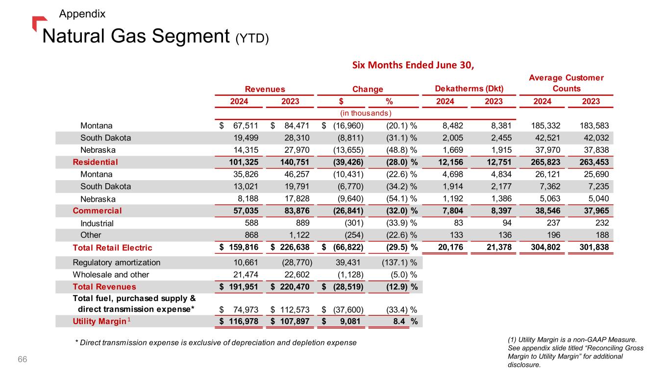 Electric Segment (YTD) (1) Utility Margin is a non-GAAP Measure. See appendix slide titled “Reconciling Gross Margin to Utility Margin” for additional disclosure. 65 Appendix 2024 2023 $ % 2024 2023 2024 2023 Montana 203,391$ 209,302$ (5,911)$ (2.8) % 1,429 1,439 326,986 321,278 South Dakota 34,702 35,457 (755) (2.1) % 290 330 51,396 51,218 Residential 238,093 244,759 (6,666) (2.7) % 1,719 1,769 378,382 372,496 Montana 201,158 214,532 (13,374) (6.2) % 1,580 1,610 75,639 74,249 South Dakota 54,128 50,262 3,866 7.7 % 546 545 13,047 12,964 Commercial 255,286 264,794 (9,508) (3.6) % 2,126 2,155 88,686 87,213 Industrial 22,951 22,563 388 1.7 % 1,464 1,270 80 79 Other 13,366 13,986 (620) (4.4) % 49 48 5,689 5,623 Total Retail Electric 529,696 546,102 (16,406) (3.0) % 5,358 5,242 472,837 465,411 Regulatory amortization 25,442 (61,551) 86,993 (141.3) % Transmission 44,824 37,245 7,579 20.3 % Wholesale and other 3,358 2,778 580 20.9 % Total Revenues 603,320 524,574 78,746 15.0 % Total fuel, purchased supply & direct transmission expense* 176,228 120,497 55,731 46.3 % Utility Margin 427,092$ 404,077$ 23,015$ 5.7 % * Direct transmission expense is exclusive of depreciation and depletion expense Megawatt Hours (MWH) Average Customer Counts Six Months Ended June 30, (in thousands) Revenues Change 1