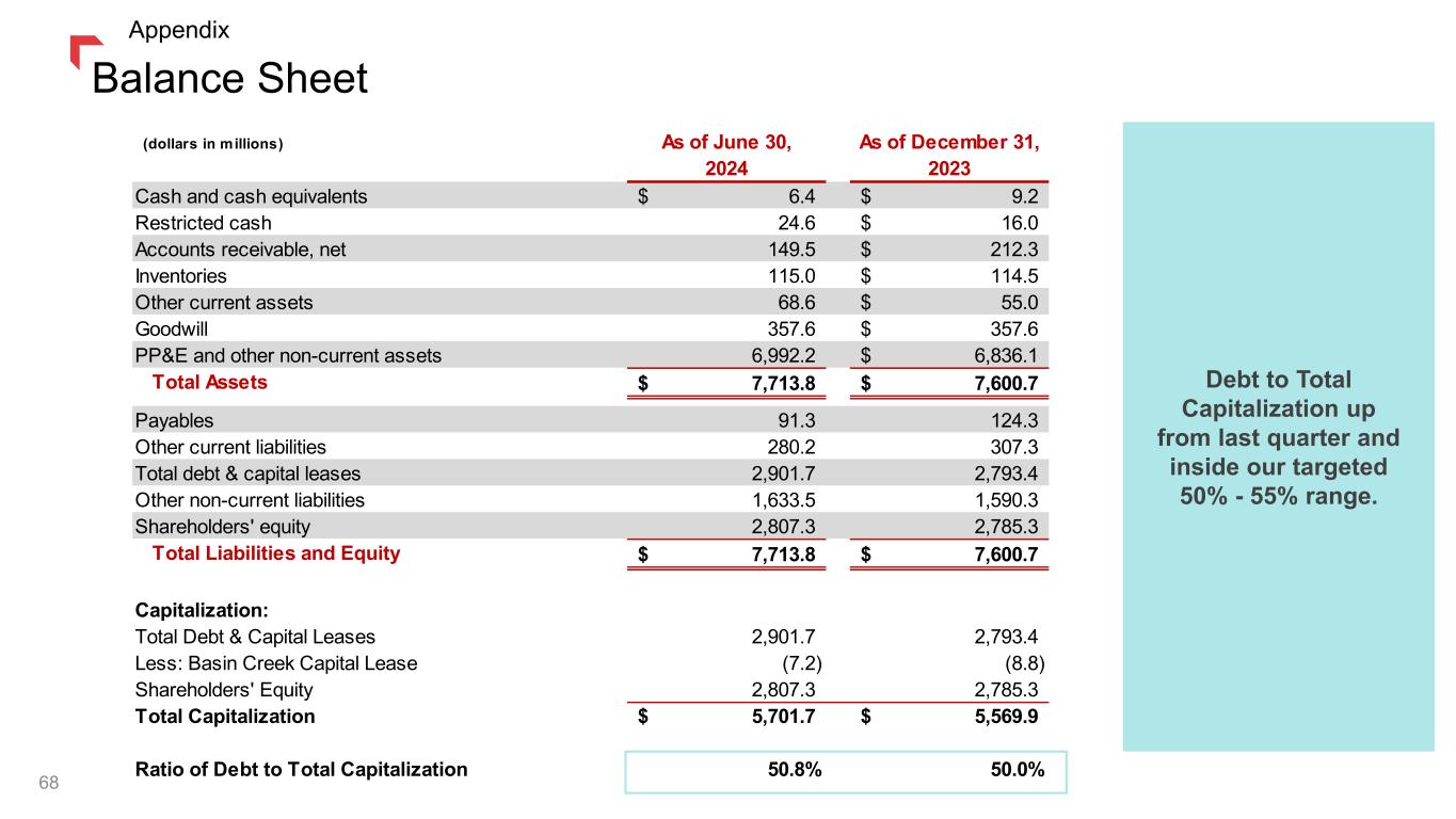 (dollars in millions) As of June 30, As of December 31, 2024 2023 Cash and cash equivalents 6.4$ 9.2$ Restricted cash 24.6 16.0$ Accounts receivable, net 149.5 212.3$ Inventories 115.0 114.5$ Other current assets 68.6 55.0$ Goodwill 357.6 357.6$ PP&E and other non-current assets 6,992.2 6,836.1$ Total Assets 7,713.8$ 7,600.7$ Payables 91.3 124.3 Other current liabilities 280.2 307.3 Total debt & capital leases 2,901.7 2,793.4 Other non-current liabilities 1,633.5 1,590.3 Shareholders' equity 2,807.3 2,785.3 Total Liabilities and Equity 7,713.8$ 7,600.7$ Capitalization: Total Debt & Capital Leases 2,901.7 2,793.4 Less: Basin Creek Capital Lease (7.2) (8.8) Shareholders' Equity 2,807.3 2,785.3 Total Capitalization 5,701.7$ 5,569.9$ Ratio of Debt to Total Capitalization 50.8% 50.0% Balance Sheet 68 Appendix Debt to Total Capitalization up from last quarter and inside our targeted 50% - 55% range.