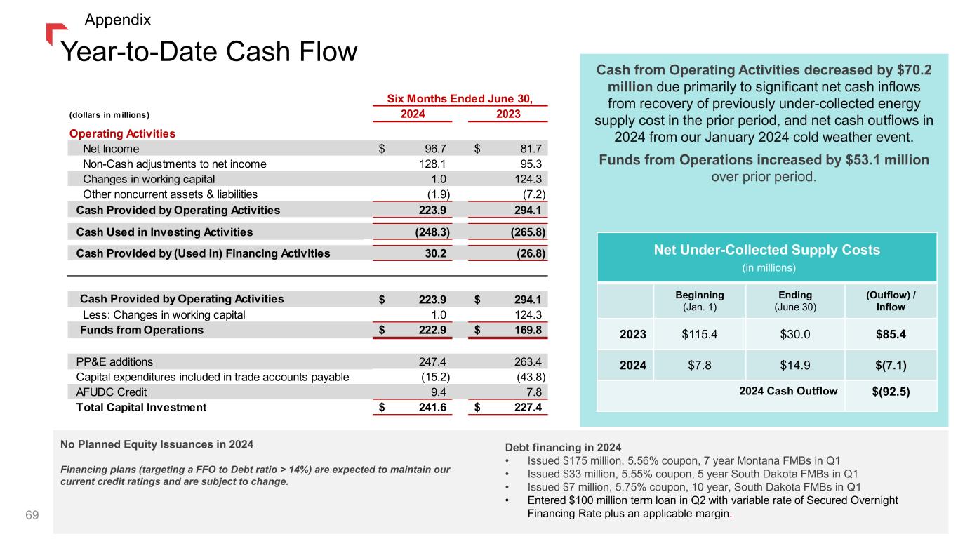 Cash from Operating Activities decreased by $70.2 million due primarily to significant net cash inflows from recovery of previously under-collected energy supply cost in the prior period, and net cash outflows in 2024 from our January 2024 cold weather event. Funds from Operations increased by $53.1 million over prior period. Net Under-Collected Supply Costs (in millions) Beginning (Jan. 1) Ending (June 30) (Outflow) / Inflow 2023 $115.4 $30.0 $85.4 2024 $7.8 $14.9 $(7.1) 2024 Cash Outflow $(92.5) Year-to-Date Cash Flow 69 No Planned Equity Issuances in 2024 Financing plans (targeting a FFO to Debt ratio > 14%) are expected to maintain our current credit ratings and are subject to change. Debt financing in 2024 • Issued $175 million, 5.56% coupon, 7 year Montana FMBs in Q1 • Issued $33 million, 5.55% coupon, 5 year South Dakota FMBs in Q1 • Issued $7 million, 5.75% coupon, 10 year, South Dakota FMBs in Q1 • Entered $100 million term loan in Q2 with variable rate of Secured Overnight Financing Rate plus an applicable margin. (dollars in millions) 2024 2023 Operating Activities Net Income 96.7$ 81.7$ Non-Cash adjustments to net income 128.1 95.3 Changes in working capital 1.0 124.3 Other noncurrent assets & liabilities (1.9) (7.2) Cash Provided by Operating Activities 223.9 294.1 Cash Used in Investing Activities (248.3) (265.8) Cash Provided by (Used In) Financing Activities 30.2 (26.8) Cash Provided by Operating Activities 223.9$ 294.1$ Less: Changes in working capital 1.0 124.3 Funds from Operations 222.9$ 169.8$ PP&E additions 247.4 263.4 Capital expenditures included in trade accounts payable (15.2) (43.8) AFUDC Credit 9.4 7.8 Total Capital Investment 241.6$ 227.4$ Six Months Ended June 30, Appendix
