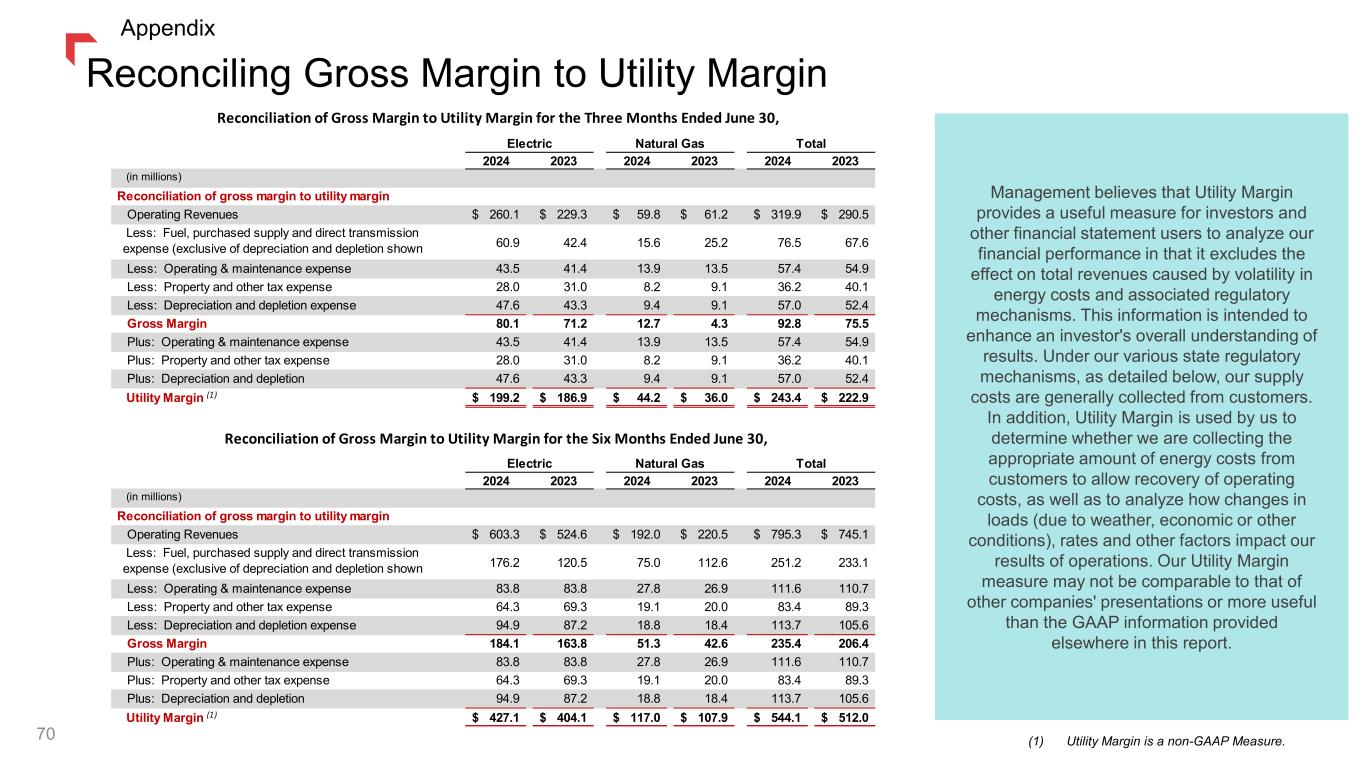 Reconciling Gross Margin to Utility Margin Management believes that Utility Margin provides a useful measure for investors and other financial statement users to analyze our financial performance in that it excludes the effect on total revenues caused by volatility in energy costs and associated regulatory mechanisms. This information is intended to enhance an investor's overall understanding of results. Under our various state regulatory mechanisms, as detailed below, our supply costs are generally collected from customers. In addition, Utility Margin is used by us to determine whether we are collecting the appropriate amount of energy costs from customers to allow recovery of operating costs, as well as to analyze how changes in loads (due to weather, economic or other conditions), rates and other factors impact our results of operations. Our Utility Margin measure may not be comparable to that of other companies' presentations or more useful than the GAAP information provided elsewhere in this report. (1) Utility Margin is a non-GAAP Measure. 70 Appendix 2024 2023 2024 2023 2024 2023 (in millions) Reconciliation of gross margin to utility margin Operating Revenues 260.1$ 229.3$ 59.8$ 61.2$ 319.9$ 290.5$ Less: Fuel, purchased supply and direct transmission expense (exclusive of depreciation and depletion shown 60.9 42.4 15.6 25.2 76.5 67.6 Less: Operating & maintenance expense 43.5 41.4 13.9 13.5 57.4 54.9 Less: Property and other tax expense 28.0 31.0 8.2 9.1 36.2 40.1 Less: Depreciation and depletion expense 47.6 43.3 9.4 9.1 57.0 52.4 Gross Margin 80.1 71.2 12.7 4.3 92.8 75.5 Plus: Operating & maintenance expense 43.5 41.4 13.9 13.5 57.4 54.9 Plus: Property and other tax expense 28.0 31.0 8.2 9.1 36.2 40.1 Plus: Depreciation and depletion 47.6 43.3 9.4 9.1 57.0 52.4 Utility Margin 199.2$ 186.9$ 44.2$ 36.0$ 243.4$ 222.9$ 2024 2023 2024 2023 2024 2023 (in millions) Reconciliation of gross margin to utility margin Operating Revenues 603.3$ 524.6$ 192.0$ 220.5$ 795.3$ 745.1$ Less: Fuel, purchased supply and direct transmission expense (exclusive of depreciation and depletion shown t l b l ) 176.2 120.5 75.0 112.6 251.2 233.1 Less: Operating & maintenance expense 83.8 83.8 27.8 26.9 111.6 110.7 Less: Property and other tax expense 64.3 69.3 19.1 20.0 83.4 89.3 Less: Depreciation and depletion expense 94.9 87.2 18.8 18.4 113.7 105.6 Gross Margin 184.1 163.8 51.3 42.6 235.4 206.4 Plus: Operating & maintenance expense 83.8 83.8 27.8 26.9 111.6 110.7 Plus: Property and other tax expense 64.3 69.3 19.1 20.0 83.4 89.3 Plus: Depreciation and depletion 94.9 87.2 18.8 18.4 113.7 105.6 Utility Margin 427.1$ 404.1$ 117.0$ 107.9$ 544.1$ 512.0$ Total Reconciliation of Gross Margin to Utility Margin for the Three Months Ended June 30, Reconciliation of Gross Margin to Utility Margin for the Six Months Ended June 30, Electric Natural Gas Total Electric Natural Gas (1) (1)