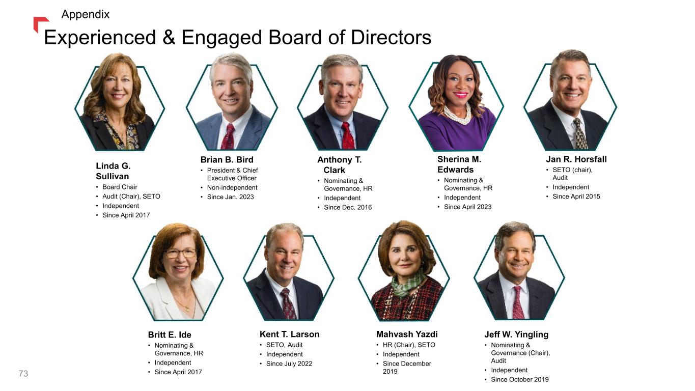 Experienced & Engaged Board of Directors 73 Britt E. Ide • Nominating & Governance, HR • Independent • Since April 2017 Anthony T. Clark • Nominating & Governance, HR • Independent • Since Dec. 2016 Jan R. Horsfall • SETO (chair), Audit • Independent • Since April 2015 Brian B. Bird • President & Chief Executive Officer • Non-independent • Since Jan. 2023 Jeff W. Yingling • Nominating & Governance (Chair), Audit • Independent • Since October 2019 Linda G. Sullivan • Board Chair • Audit (Chair), SETO • Independent • Since April 2017 Mahvash Yazdi • HR (Chair), SETO • Independent • Since December 2019 Kent T. Larson • SETO, Audit • Independent • Since July 2022 Sherina M. Edwards • Nominating & Governance, HR • Independent • Since April 2023 Appendix