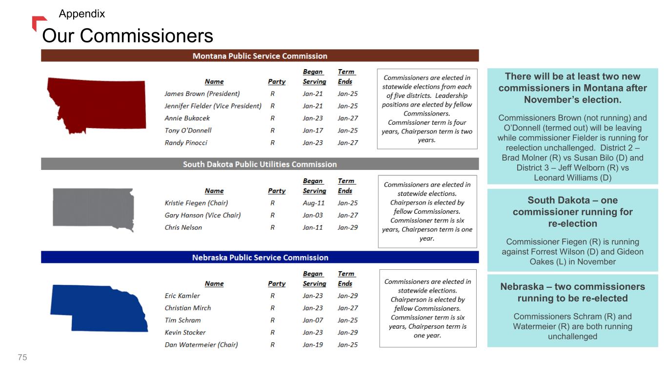 Our Commissioners 75 Appendix There will be at least two new commissioners in Montana after November’s election. Commissioners Brown (not running) and O’Donnell (termed out) will be leaving while commissioner Fielder is running for reelection unchallenged. District 2 – Brad Molner (R) vs Susan Bilo (D) and District 3 – Jeff Welborn (R) vs Leonard Williams (D) South Dakota – one commissioner running for re-election Commissioner Fiegen (R) is running against Forrest Wilson (D) and Gideon Oakes (L) in November Nebraska – two commissioners running to be re-elected Commissioners Schram (R) and Watermeier (R) are both running unchallenged