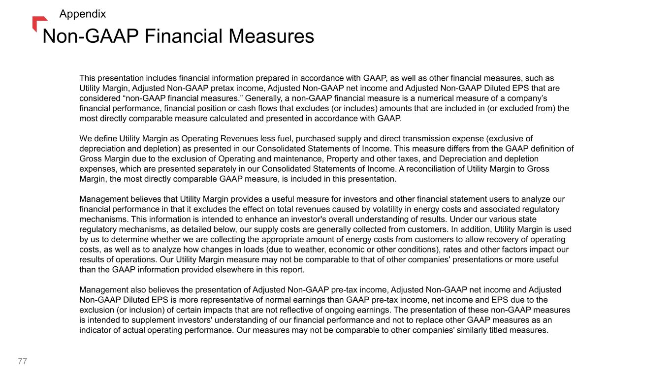 Non-GAAP Financial Measures This presentation includes financial information prepared in accordance with GAAP, as well as other financial measures, such as Utility Margin, Adjusted Non-GAAP pretax income, Adjusted Non-GAAP net income and Adjusted Non-GAAP Diluted EPS that are considered “non-GAAP financial measures.” Generally, a non-GAAP financial measure is a numerical measure of a company’s financial performance, financial position or cash flows that excludes (or includes) amounts that are included in (or excluded from) the most directly comparable measure calculated and presented in accordance with GAAP. We define Utility Margin as Operating Revenues less fuel, purchased supply and direct transmission expense (exclusive of depreciation and depletion) as presented in our Consolidated Statements of Income. This measure differs from the GAAP definition of Gross Margin due to the exclusion of Operating and maintenance, Property and other taxes, and Depreciation and depletion expenses, which are presented separately in our Consolidated Statements of Income. A reconciliation of Utility Margin to Gross Margin, the most directly comparable GAAP measure, is included in this presentation. Management believes that Utility Margin provides a useful measure for investors and other financial statement users to analyze our financial performance in that it excludes the effect on total revenues caused by volatility in energy costs and associated regulatory mechanisms. This information is intended to enhance an investor's overall understanding of results. Under our various state regulatory mechanisms, as detailed below, our supply costs are generally collected from customers. In addition, Utility Margin is used by us to determine whether we are collecting the appropriate amount of energy costs from customers to allow recovery of operating costs, as well as to analyze how changes in loads (due to weather, economic or other conditions), rates and other factors impact our results of operations. Our Utility Margin measure may not be comparable to that of other companies' presentations or more useful than the GAAP information provided elsewhere in this report. Management also believes the presentation of Adjusted Non-GAAP pre-tax income, Adjusted Non-GAAP net income and Adjusted Non-GAAP Diluted EPS is more representative of normal earnings than GAAP pre-tax income, net income and EPS due to the exclusion (or inclusion) of certain impacts that are not reflective of ongoing earnings. The presentation of these non-GAAP measures is intended to supplement investors' understanding of our financial performance and not to replace other GAAP measures as an indicator of actual operating performance. Our measures may not be comparable to other companies' similarly titled measures. 77 Appendix