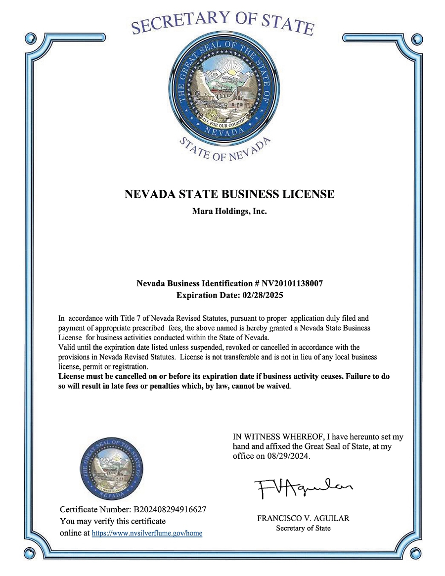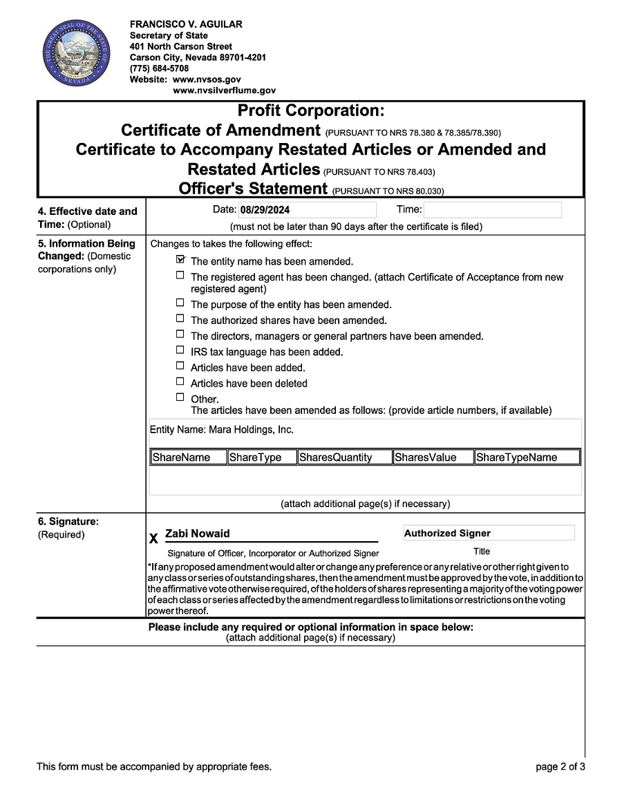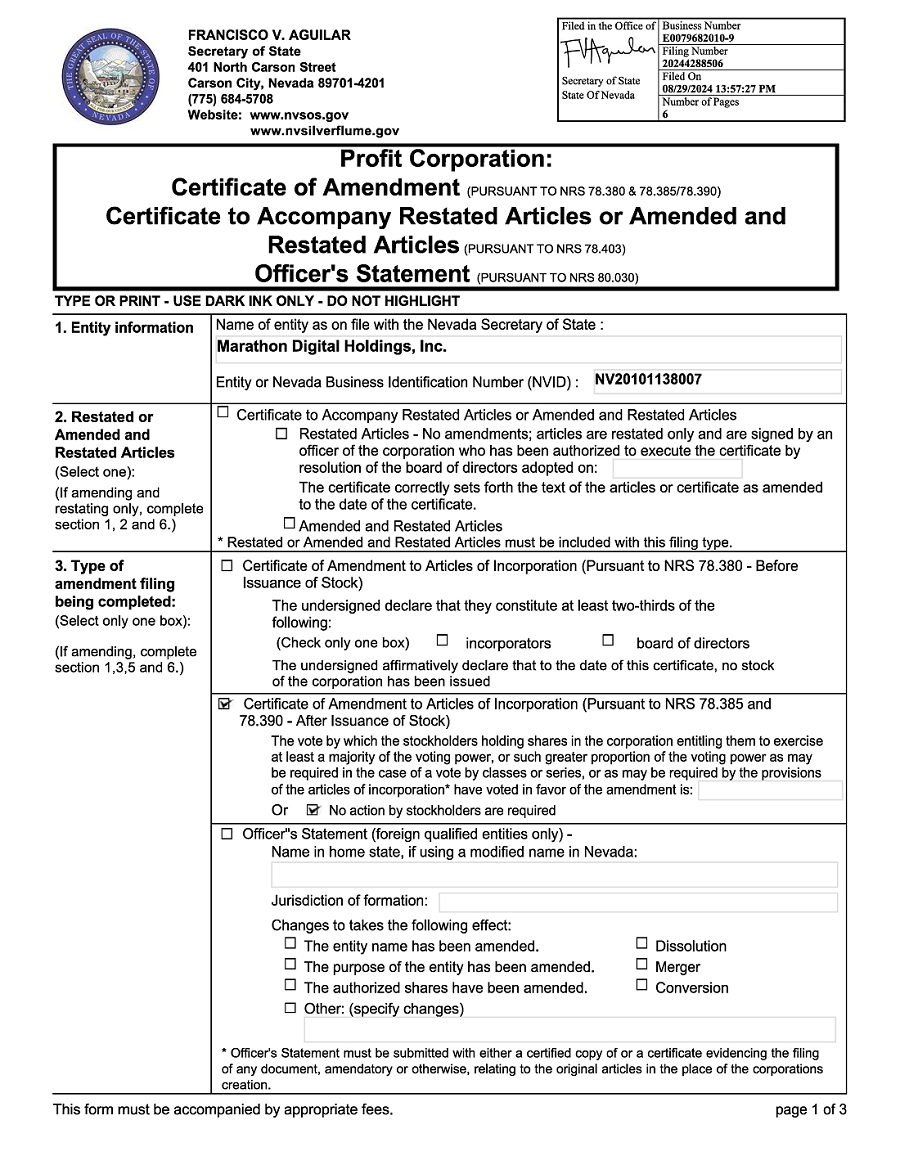 On August 29, 2024, the Company filed an amendment to its Restated Articles of Incorporation with the Secretary of State of Nevada to change its name from “Marathon Digital Holdings, Inc.” to “MARA Holdings, Inc.,” effective immediately.