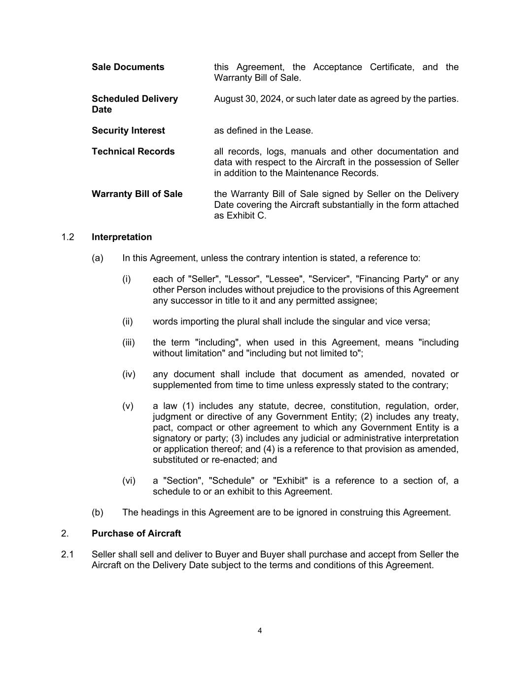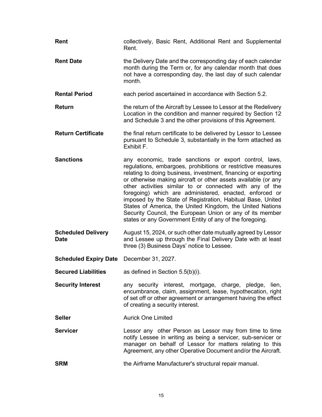 15 Rent collectively, Basic Rent, Additional Rent and Supplemental Rent. Rent Date the Delivery Date and the corresponding day of each calendar month during the Term or, for any calendar month that does not have a corresponding day, the last day of such calendar month. Rental Period each period ascertained in accordance with Section 5.2. Return the return of the Aircraft by Lessee to Lessor at the Redelivery Location in the condition and manner required by Section 12 and Schedule 3 and the other provisions of this Agreement. Return Certificate the final return certificate to be delivered by Lessor to Lessee pursuant to Schedule 3, substantially in the form attached as Exhibit F. Sanctions any economic, trade sanctions or export control, laws, regulations, embargoes, prohibitions or restrictive measures relating to doing business, investment, financing or exporting or otherwise making aircraft or other assets available (or any other activities similar to or connected with any of the foregoing) which are administered, enacted, enforced or imposed by the State of Registration, Habitual Base, United States of America, the United Kingdom, the United Nations Security Council, the European Union or any of its member states or any Government Entity of any of the foregoing. Scheduled Delivery Date August 15, 2024, or such other date mutually agreed by Lessor and Lessee up through the Final Delivery Date with at least three (3) Business Days’ notice to Lessee. Scheduled Expiry Date December 31, 2027. Secured Liabilities as defined in Section 5.5(b)(i). Security Interest any security interest, mortgage, charge, pledge, lien, encumbrance, claim, assignment, lease, hypothecation, right of set off or other agreement or arrangement having the effect of creating a security interest. Seller Aurick One Limited Servicer Lessor any other Person as Lessor may from time to time notify Lessee in writing as being a servicer, sub-servicer or manager on behalf of Lessor for matters relating to this Agreement, any other Operative Document and/or the Aircraft. SRM the Airframe Manufacturer's structural repair manual.