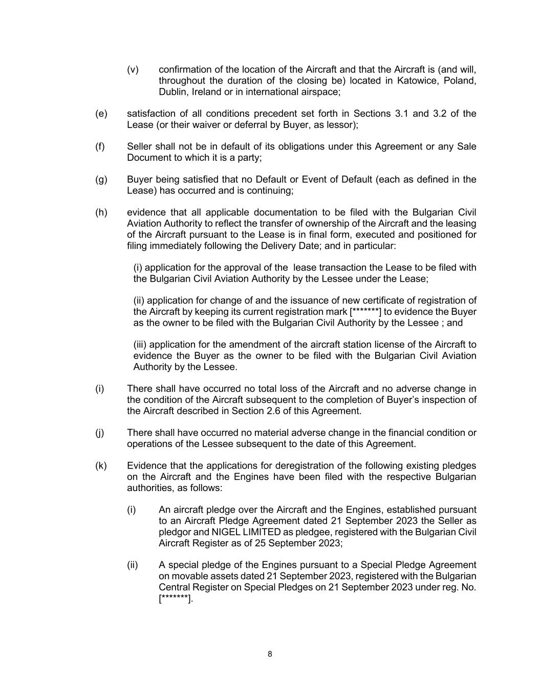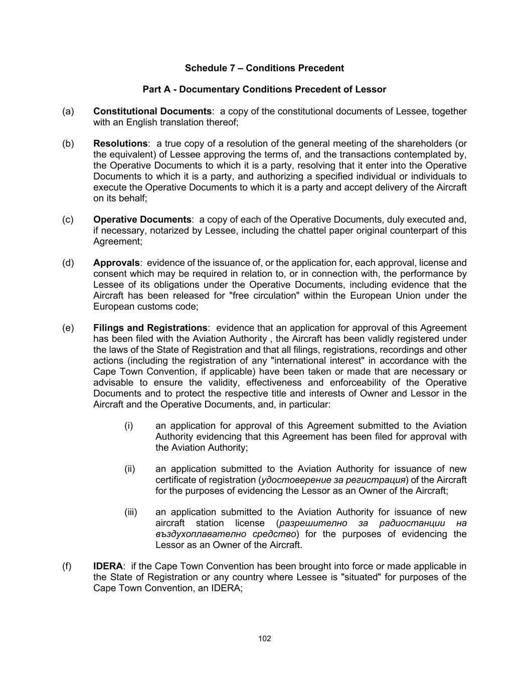 102 Schedule 7 – Conditions Precedent Part A - Documentary Conditions Precedent of Lessor (a) Constitutional Documents: a copy of the constitutional documents of Lessee, together with an English translation thereof; (b) Resolutions: a true copy of a resolution of the general meeting of the shareholders (or the equivalent) of Lessee approving the terms of, and the transactions contemplated by, the Operative Documents to which it is a party, resolving that it enter into the Operative Documents to which it is a party, and authorizing a specified individual or individuals to execute the Operative Documents to which it is a party and accept delivery of the Aircraft on its behalf; (c) Operative Documents: a copy of each of the Operative Documents, duly executed and, if necessary, notarized by Lessee, including the chattel paper original counterpart of this Agreement; (d) Approvals: evidence of the issuance of, or the application for, each approval, license and consent which may be required in relation to, or in connection with, the performance by Lessee of its obligations under the Operative Documents, including evidence that the Aircraft has been released for "free circulation" within the European Union under the European customs code; (e) Filings and Registrations: evidence that an application for approval of this Agreement has been filed with the Aviation Authority , the Aircraft has been validly registered under the laws of the State of Registration and that all filings, registrations, recordings and other actions (including the registration of any "international interest" in accordance with the Cape Town Convention, if applicable) have been taken or made that are necessary or advisable to ensure the validity, effectiveness and enforceability of the Operative Documents and to protect the respective title and interests of Owner and Lessor in the Aircraft and the Operative Documents, and, in particular: (i) an application for approval of this Agreement submitted to the Aviation Authority evidencing that this Agreement has been filed for approval with the Aviation Authority; (ii) an application submitted to the Aviation Authority for issuance of new certificate of registration (удостоверение за регистрация) of the Aircraft for the purposes of evidencing the Lessor as an Owner of the Aircraft; (iii) an application submitted to the Aviation Authority for issuance of new aircraft station license (разрешително за радиостанции на въздухоплавателно средство) for the purposes of evidencing the Lessor as an Owner of the Aircraft. (f) IDERA: if the Cape Town Convention has been brought into force or made applicable in the State of Registration or any country where Lessee is "situated" for purposes of the Cape Town Convention, an IDERA;