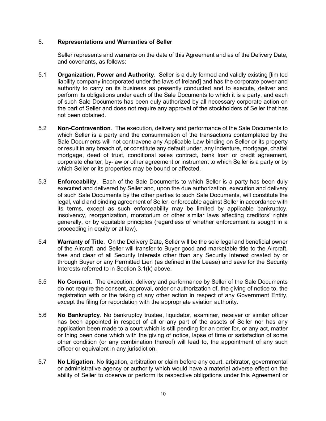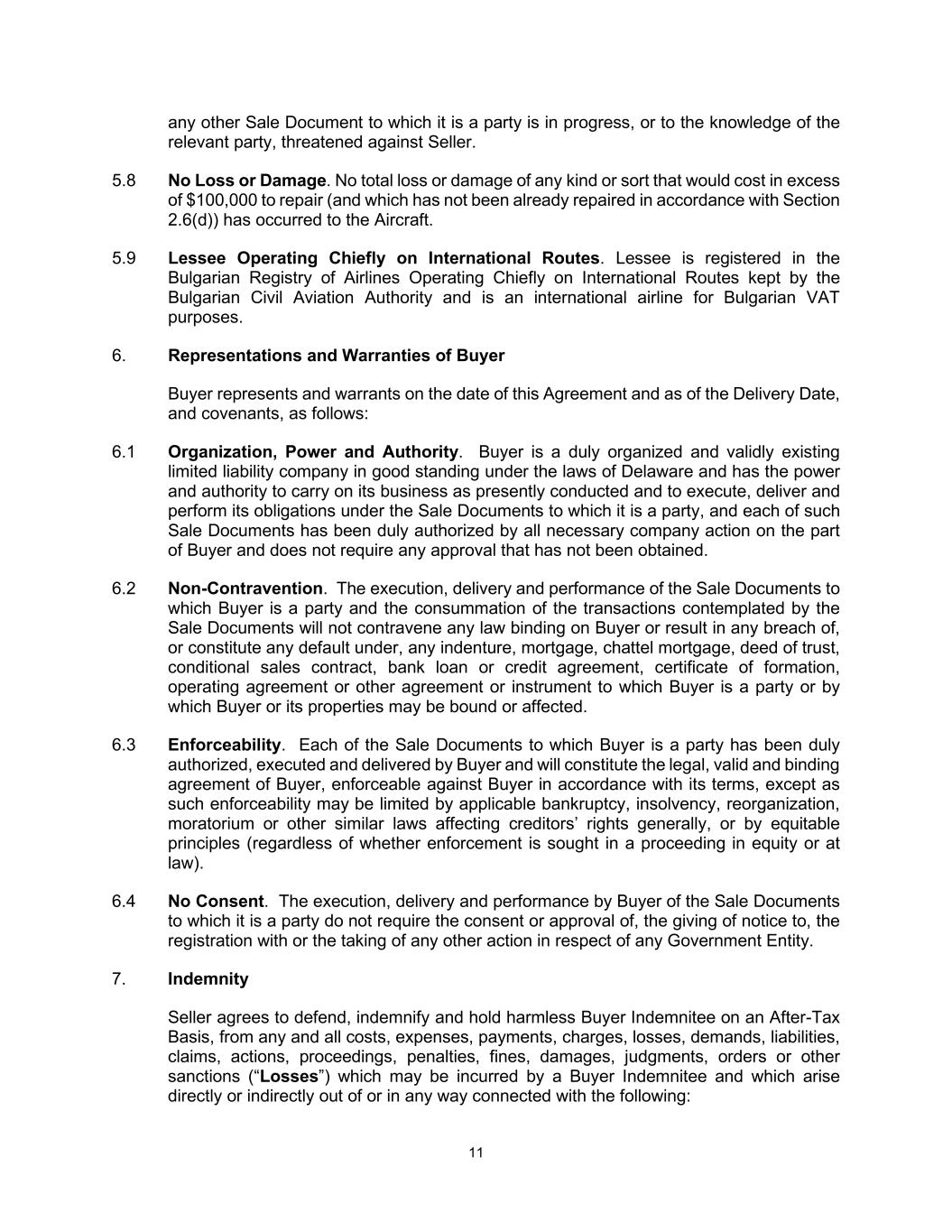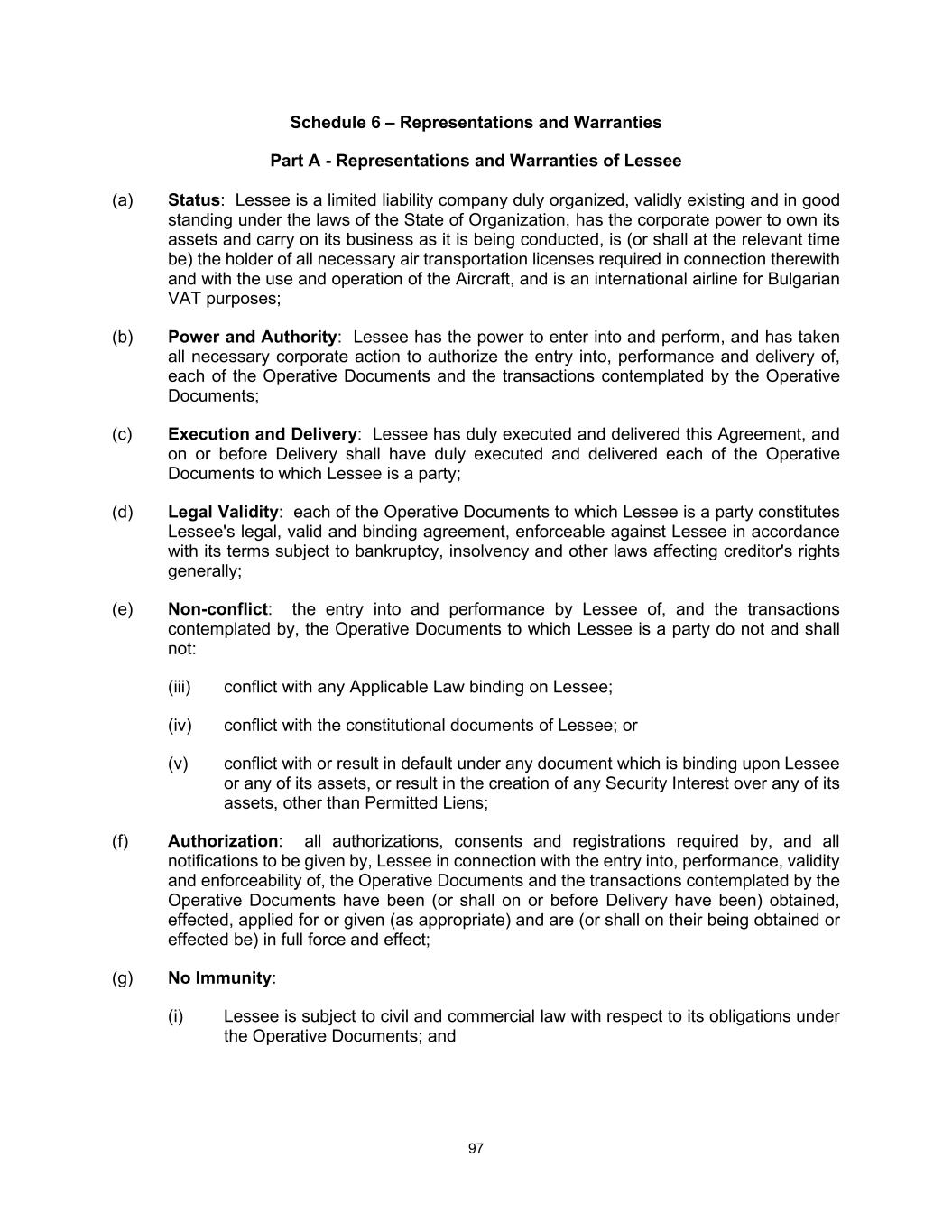 97 Schedule 6 – Representations and Warranties Part A - Representations and Warranties of Lessee (a) Status: Lessee is a limited liability company duly organized, validly existing and in good standing under the laws of the State of Organization, has the corporate power to own its assets and carry on its business as it is being conducted, is (or shall at the relevant time be) the holder of all necessary air transportation licenses required in connection therewith and with the use and operation of the Aircraft, and is an international airline for Bulgarian VAT purposes; (b) Power and Authority: Lessee has the power to enter into and perform, and has taken all necessary corporate action to authorize the entry into, performance and delivery of, each of the Operative Documents and the transactions contemplated by the Operative Documents; (c) Execution and Delivery: Lessee has duly executed and delivered this Agreement, and on or before Delivery shall have duly executed and delivered each of the Operative Documents to which Lessee is a party; (d) Legal Validity: each of the Operative Documents to which Lessee is a party constitutes Lessee's legal, valid and binding agreement, enforceable against Lessee in accordance with its terms subject to bankruptcy, insolvency and other laws affecting creditor's rights generally; (e) Non-conflict: the entry into and performance by Lessee of, and the transactions contemplated by, the Operative Documents to which Lessee is a party do not and shall not: (iii) conflict with any Applicable Law binding on Lessee; (iv) conflict with the constitutional documents of Lessee; or (v) conflict with or result in default under any document which is binding upon Lessee or any of its assets, or result in the creation of any Security Interest over any of its assets, other than Permitted Liens; (f) Authorization: all authorizations, consents and registrations required by, and all notifications to be given by, Lessee in connection with the entry into, performance, validity and enforceability of, the Operative Documents and the transactions contemplated by the Operative Documents have been (or shall on or before Delivery have been) obtained, effected, applied for or given (as appropriate) and are (or shall on their being obtained or effected be) in full force and effect; (g) No Immunity: (i) Lessee is subject to civil and commercial law with respect to its obligations under the Operative Documents; and