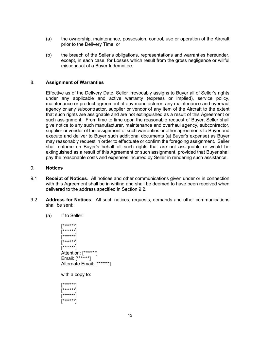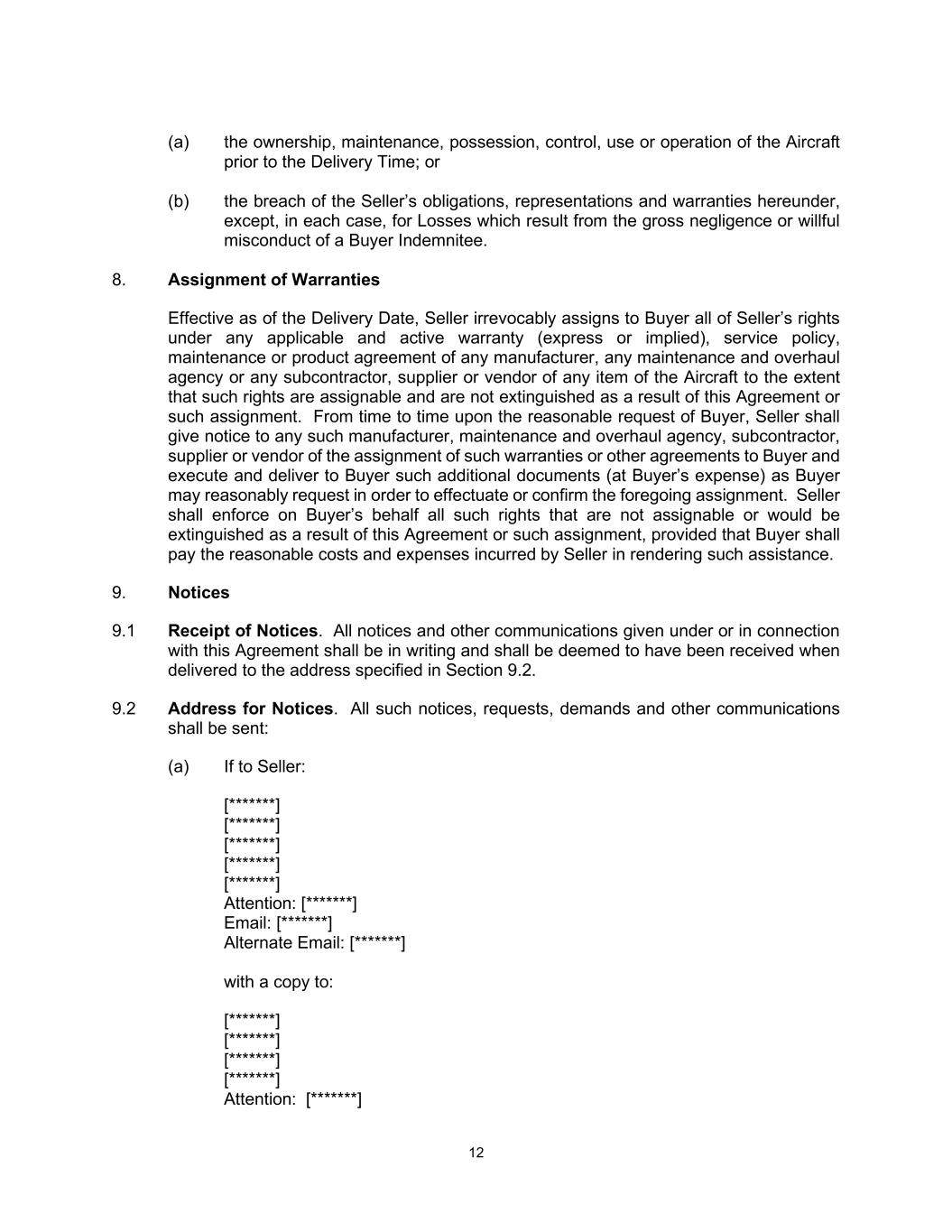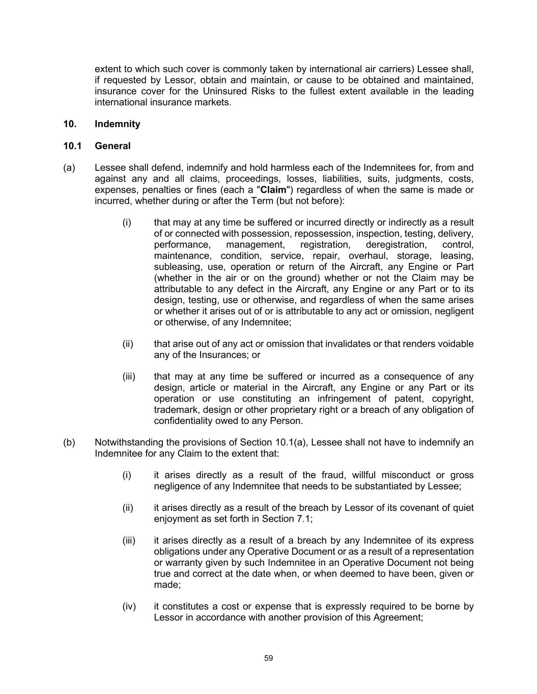59 extent to which such cover is commonly taken by international air carriers) Lessee shall, if requested by Lessor, obtain and maintain, or cause to be obtained and maintained, insurance cover for the Uninsured Risks to the fullest extent available in the leading international insurance markets. 10. Indemnity 10.1 General (a) Lessee shall defend, indemnify and hold harmless each of the Indemnitees for, from and against any and all claims, proceedings, losses, liabilities, suits, judgments, costs, expenses, penalties or fines (each a "Claim") regardless of when the same is made or incurred, whether during or after the Term (but not before): (i) that may at any time be suffered or incurred directly or indirectly as a result of or connected with possession, repossession, inspection, testing, delivery, performance, management, registration, deregistration, control, maintenance, condition, service, repair, overhaul, storage, leasing, subleasing, use, operation or return of the Aircraft, any Engine or Part (whether in the air or on the ground) whether or not the Claim may be attributable to any defect in the Aircraft, any Engine or any Part or to its design, testing, use or otherwise, and regardless of when the same arises or whether it arises out of or is attributable to any act or omission, negligent or otherwise, of any Indemnitee; (ii) that arise out of any act or omission that invalidates or that renders voidable any of the Insurances; or (iii) that may at any time be suffered or incurred as a consequence of any design, article or material in the Aircraft, any Engine or any Part or its operation or use constituting an infringement of patent, copyright, trademark, design or other proprietary right or a breach of any obligation of confidentiality owed to any Person. (b) Notwithstanding the provisions of Section 10.1(a), Lessee shall not have to indemnify an Indemnitee for any Claim to the extent that: (i) it arises directly as a result of the fraud, willful misconduct or gross negligence of any Indemnitee that needs to be substantiated by Lessee; (ii) it arises directly as a result of the breach by Lessor of its covenant of quiet enjoyment as set forth in Section 7.1; (iii) it arises directly as a result of a breach by any Indemnitee of its express obligations under any Operative Document or as a result of a representation or warranty given by such Indemnitee in an Operative Document not being true and correct at the date when, or when deemed to have been, given or made; (iv) it constitutes a cost or expense that is expressly required to be borne by Lessor in accordance with another provision of this Agreement;