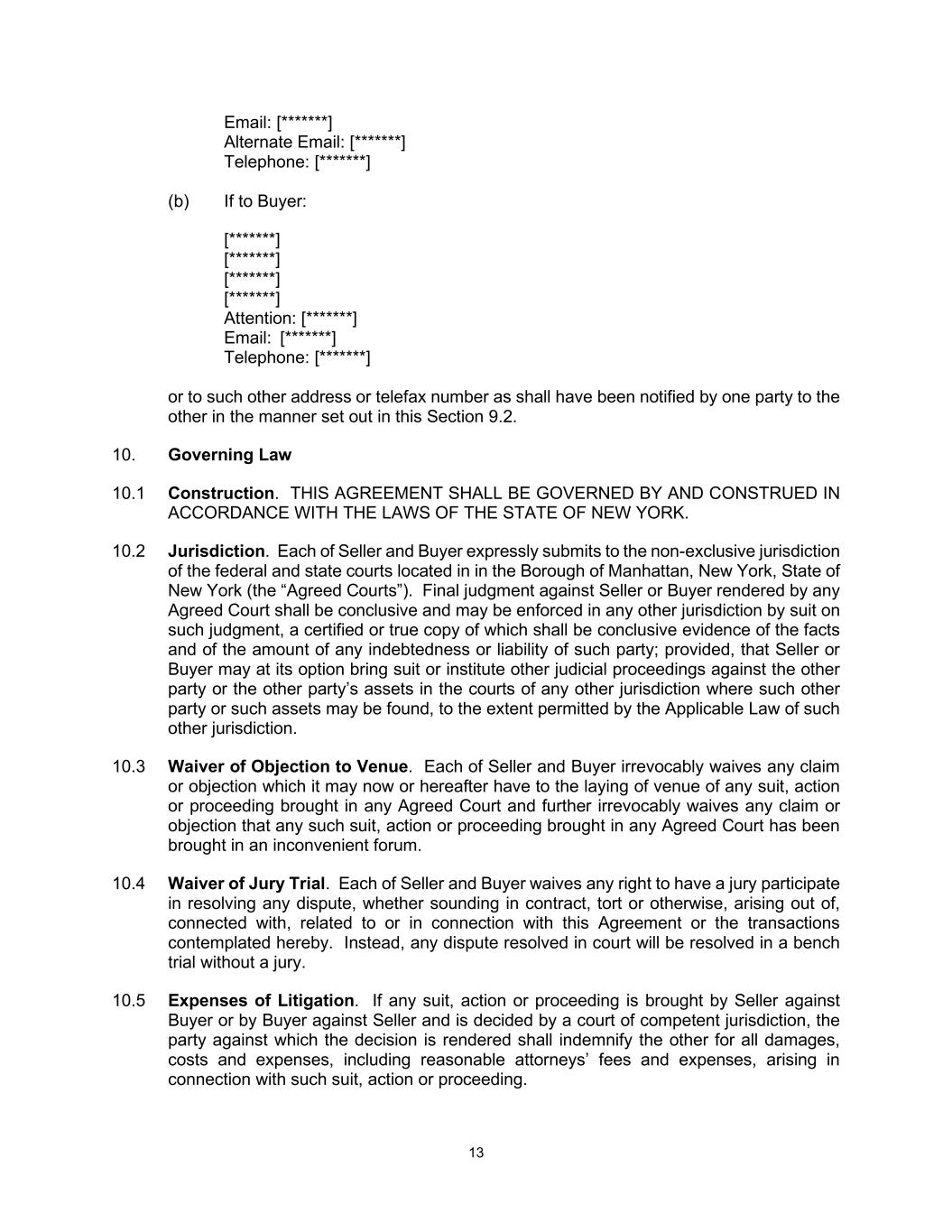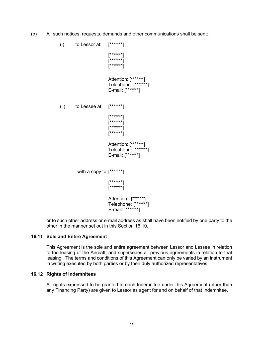 77 (b) All such notices, requests, demands and other communications shall be sent: (i) to Lessor at: [*******] [*******] [*******] [*******] Attention: [*******] Telephone: [*******] E-mail: [*******] (ii) to Lessee at: [*******] [*******] [*******] [*******] [*******] Attention: [*******] Telephone: [*******] E-mail: [*******] with a copy to: [*******] [*******] [*******] Attention: [*******] Telephone: [*******] E-mail: [*******] or to such other address or e-mail address as shall have been notified by one party to the other in the manner set out in this Section 16.10. 16.11 Sole and Entire Agreement This Agreement is the sole and entire agreement between Lessor and Lessee in relation to the leasing of the Aircraft, and supersedes all previous agreements in relation to that leasing. The terms and conditions of this Agreement can only be varied by an instrument in writing executed by both parties or by their duly authorized representatives. 16.12 Rights of Indemnitees All rights expressed to be granted to each Indemnitee under this Agreement (other than any Financing Party) are given to Lessor as agent for and on behalf of that Indemnitee.