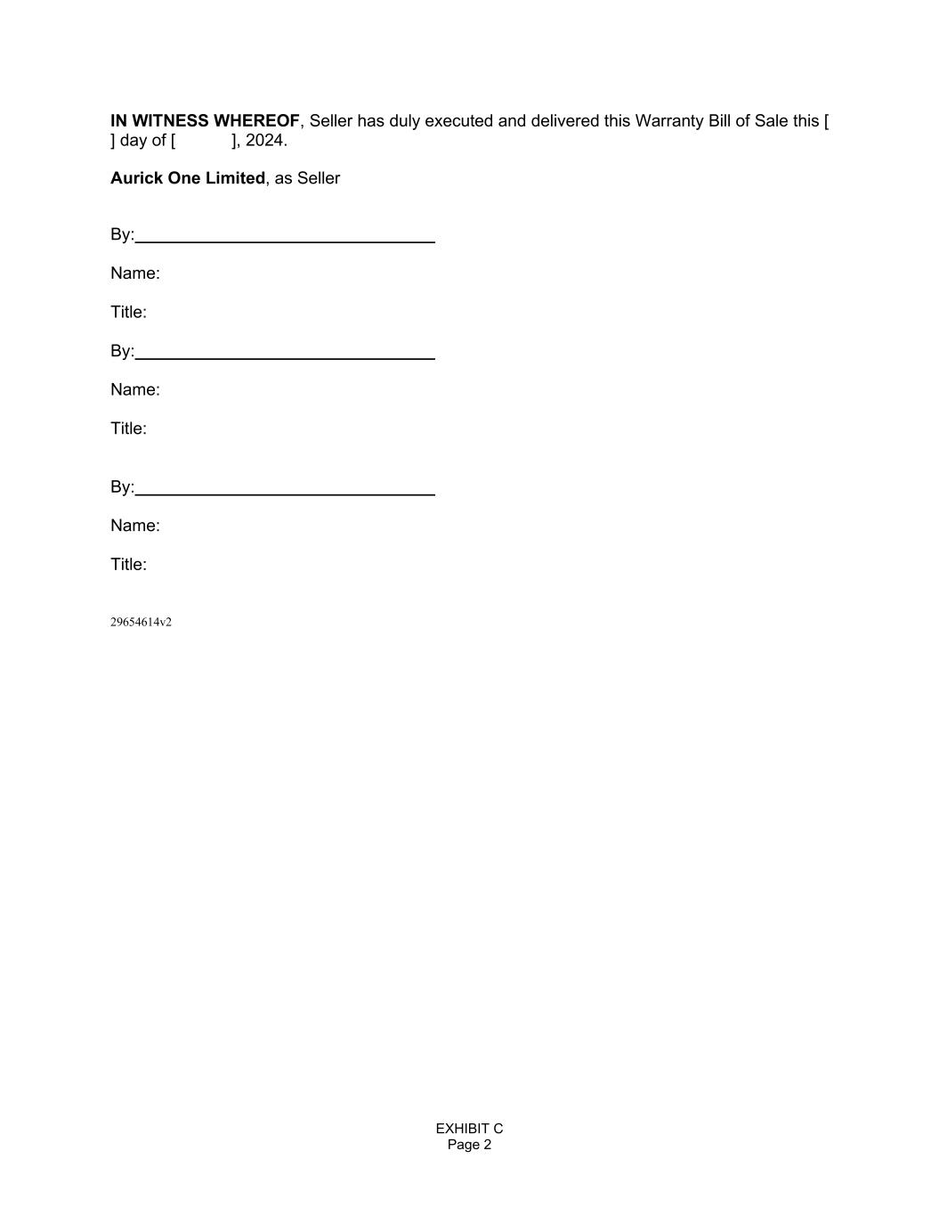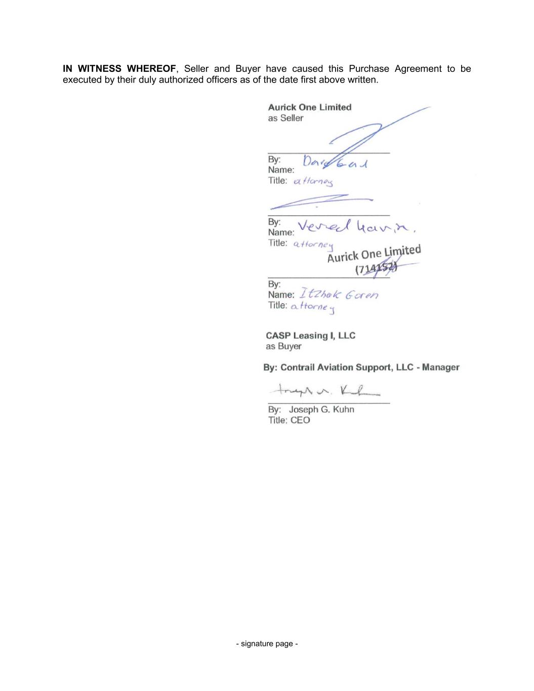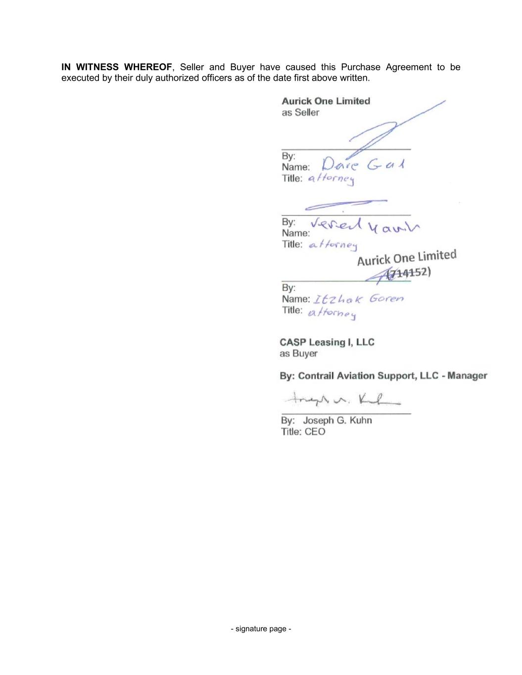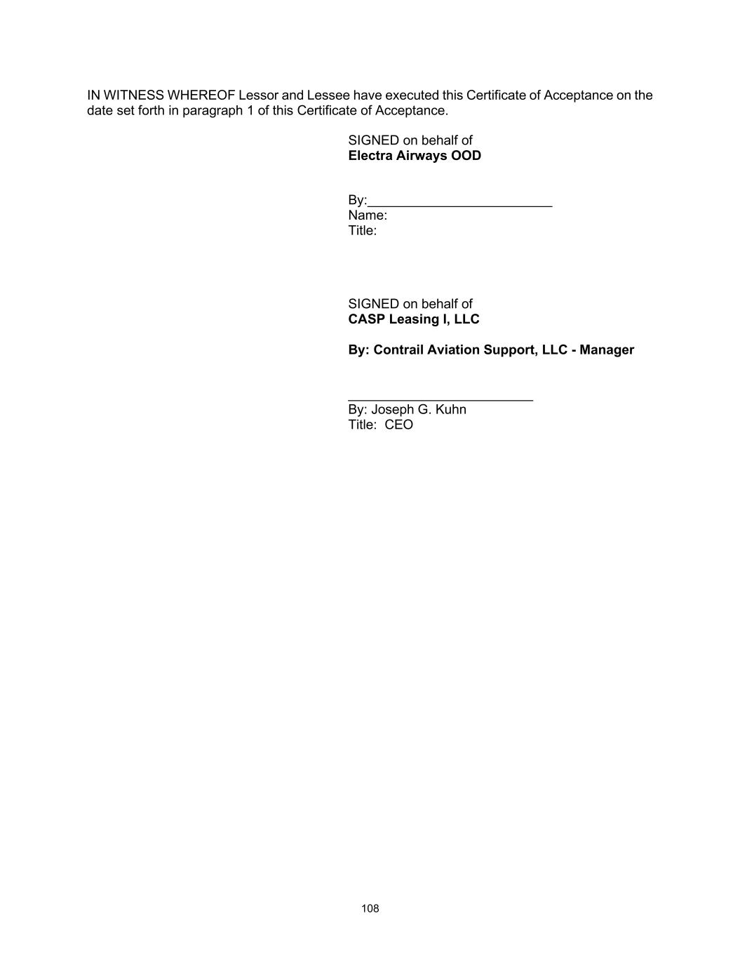 108 IN WITNESS WHEREOF Lessor and Lessee have executed this Certificate of Acceptance on the date set forth in paragraph 1 of this Certificate of Acceptance. SIGNED on behalf of Electra Airways OOD By:_________________________ Name: Title: SIGNED on behalf of CASP Leasing I, LLC By: Contrail Aviation Support, LLC - Manager _________________________ By: Joseph G. Kuhn Title: CEO