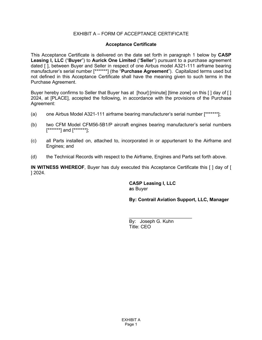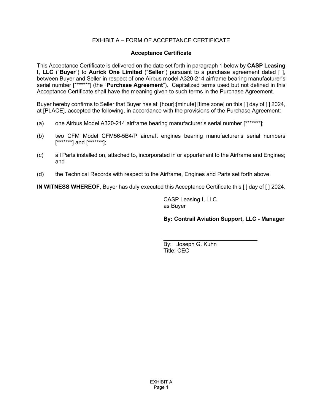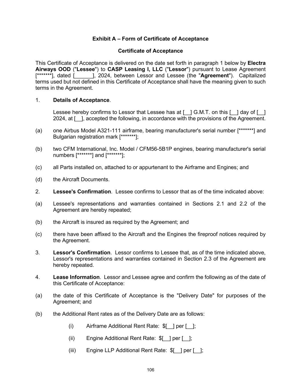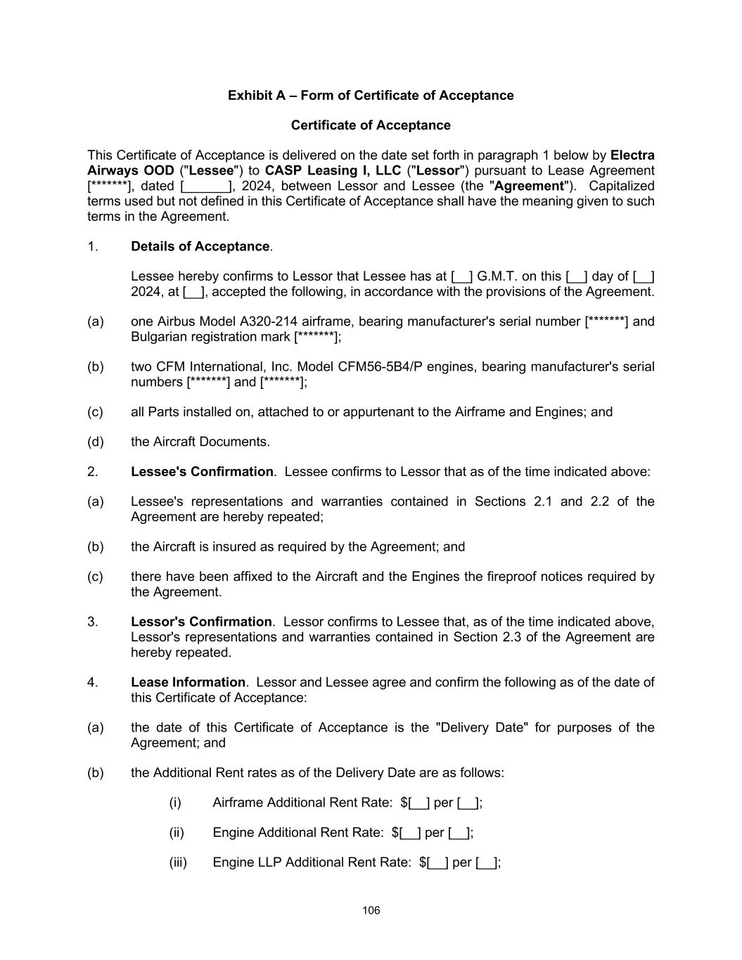 106 Exhibit A – Form of Certificate of Acceptance Certificate of Acceptance This Certificate of Acceptance is delivered on the date set forth in paragraph 1 below by Electra Airways OOD ("Lessee") to CASP Leasing I, LLC ("Lessor") pursuant to Lease Agreement [*******], dated [______], 2024, between Lessor and Lessee (the "Agreement"). Capitalized terms used but not defined in this Certificate of Acceptance shall have the meaning given to such terms in the Agreement. 1. Details of Acceptance. Lessee hereby confirms to Lessor that Lessee has at [__] G.M.T. on this [__] day of [__] 2024, at [__], accepted the following, in accordance with the provisions of the Agreement. (a) one Airbus Model A321-111 airframe, bearing manufacturer's serial number [*******] and Bulgarian registration mark [*******]; (b) two CFM International, Inc. Model / CFM56-5B1P engines, bearing manufacturer's serial numbers [*******] and [*******]; (c) all Parts installed on, attached to or appurtenant to the Airframe and Engines; and (d) the Aircraft Documents. 2. Lessee's Confirmation. Lessee confirms to Lessor that as of the time indicated above: (a) Lessee's representations and warranties contained in Sections 2.1 and 2.2 of the Agreement are hereby repeated; (b) the Aircraft is insured as required by the Agreement; and (c) there have been affixed to the Aircraft and the Engines the fireproof notices required by the Agreement. 3. Lessor's Confirmation. Lessor confirms to Lessee that, as of the time indicated above, Lessor's representations and warranties contained in Section 2.3 of the Agreement are hereby repeated. 4. Lease Information. Lessor and Lessee agree and confirm the following as of the date of this Certificate of Acceptance: (a) the date of this Certificate of Acceptance is the "Delivery Date" for purposes of the Agreement; and (b) the Additional Rent rates as of the Delivery Date are as follows: (i) Airframe Additional Rent Rate: $[__] per [__]; (ii) Engine Additional Rent Rate: $[__] per [__]; (iii) Engine LLP Additional Rent Rate: $[__] per [__];