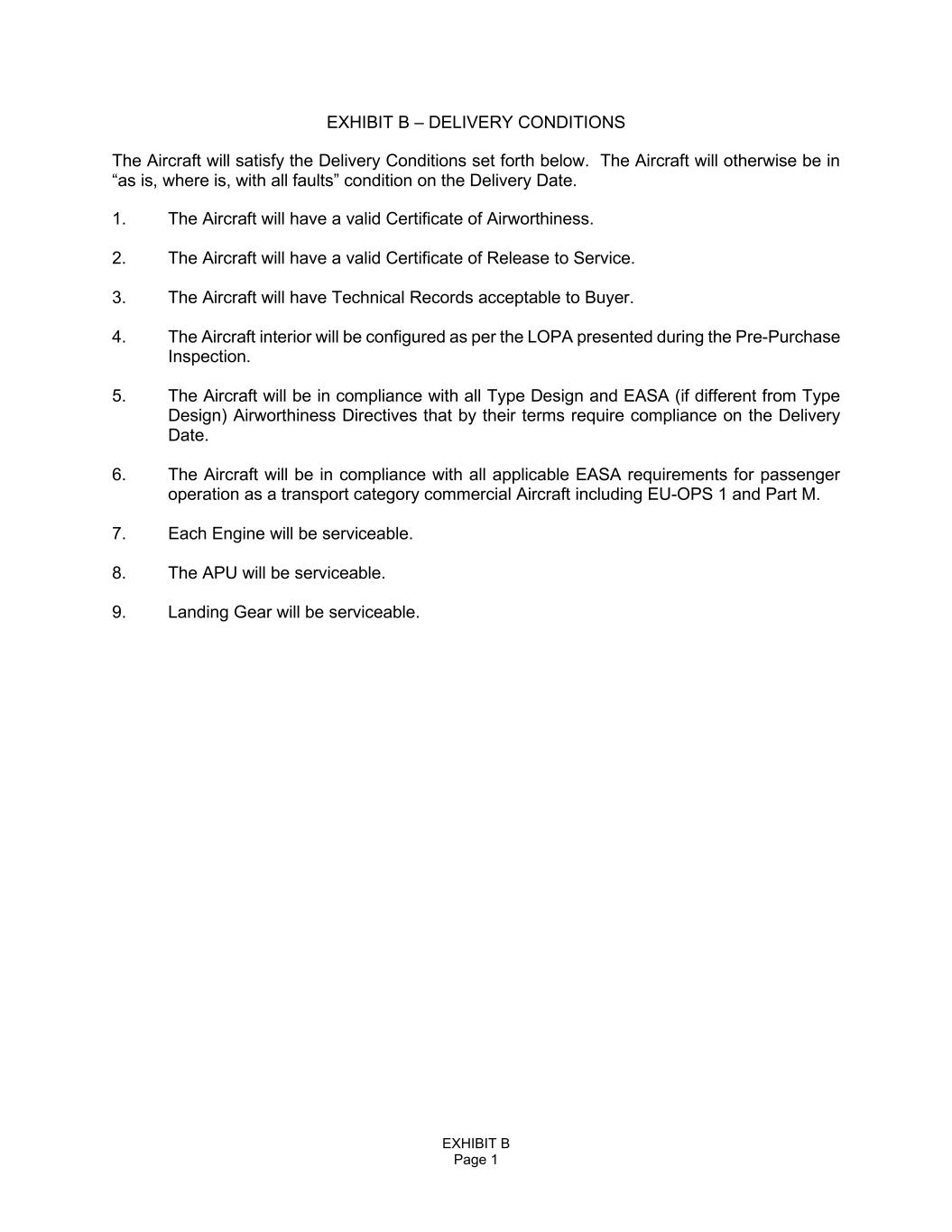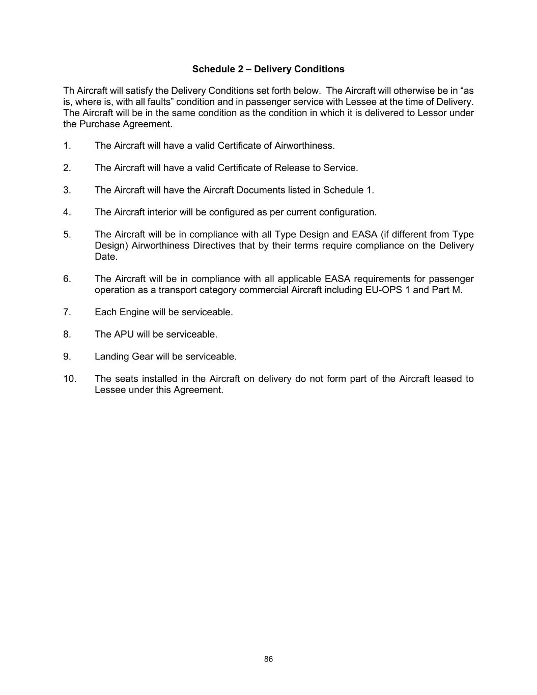 86 Schedule 2 – Delivery Conditions Th Aircraft will satisfy the Delivery Conditions set forth below. The Aircraft will otherwise be in “as is, where is, with all faults” condition and in passenger service with Lessee at the time of Delivery. The Aircraft will be in the same condition as the condition in which it is delivered to Lessor under the Purchase Agreement. 1. The Aircraft will have a valid Certificate of Airworthiness. 2. The Aircraft will have a valid Certificate of Release to Service. 3. The Aircraft will have the Aircraft Documents listed in Schedule 1. 4. The Aircraft interior will be configured as per current configuration. 5. The Aircraft will be in compliance with all Type Design and EASA (if different from Type Design) Airworthiness Directives that by their terms require compliance on the Delivery Date. 6. The Aircraft will be in compliance with all applicable EASA requirements for passenger operation as a transport category commercial Aircraft including EU-OPS 1 and Part M. 7. Each Engine will be serviceable. 8. The APU will be serviceable. 9. Landing Gear will be serviceable. 10. The seats installed in the Aircraft on delivery do not form part of the Aircraft leased to Lessee under this Agreement.