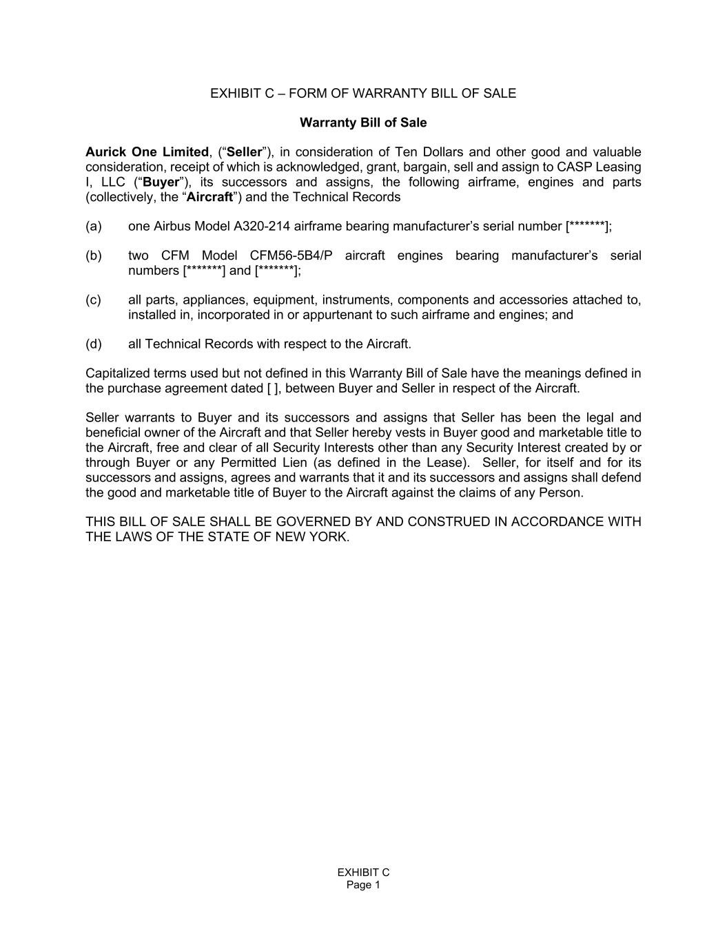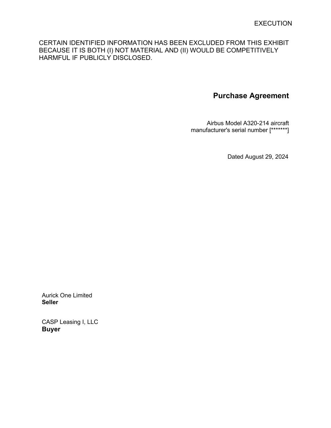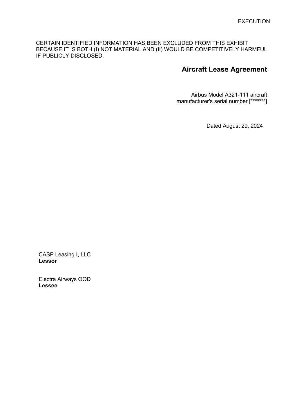 EXECUTION CERTAIN IDENTIFIED INFORMATION HAS BEEN EXCLUDED FROM THIS EXHIBIT BECAUSE IT IS BOTH (I) NOT MATERIAL AND (II) WOULD BE COMPETITIVELY HARMFUL IF PUBLICLY DISCLOSED. Aircraft Lease Agreement Airbus Model A321-111 aircraft manufacturer's serial number [*******] Dated August 29, 2024 CASP Leasing I, LLC Lessor Electra Airways OOD Lessee