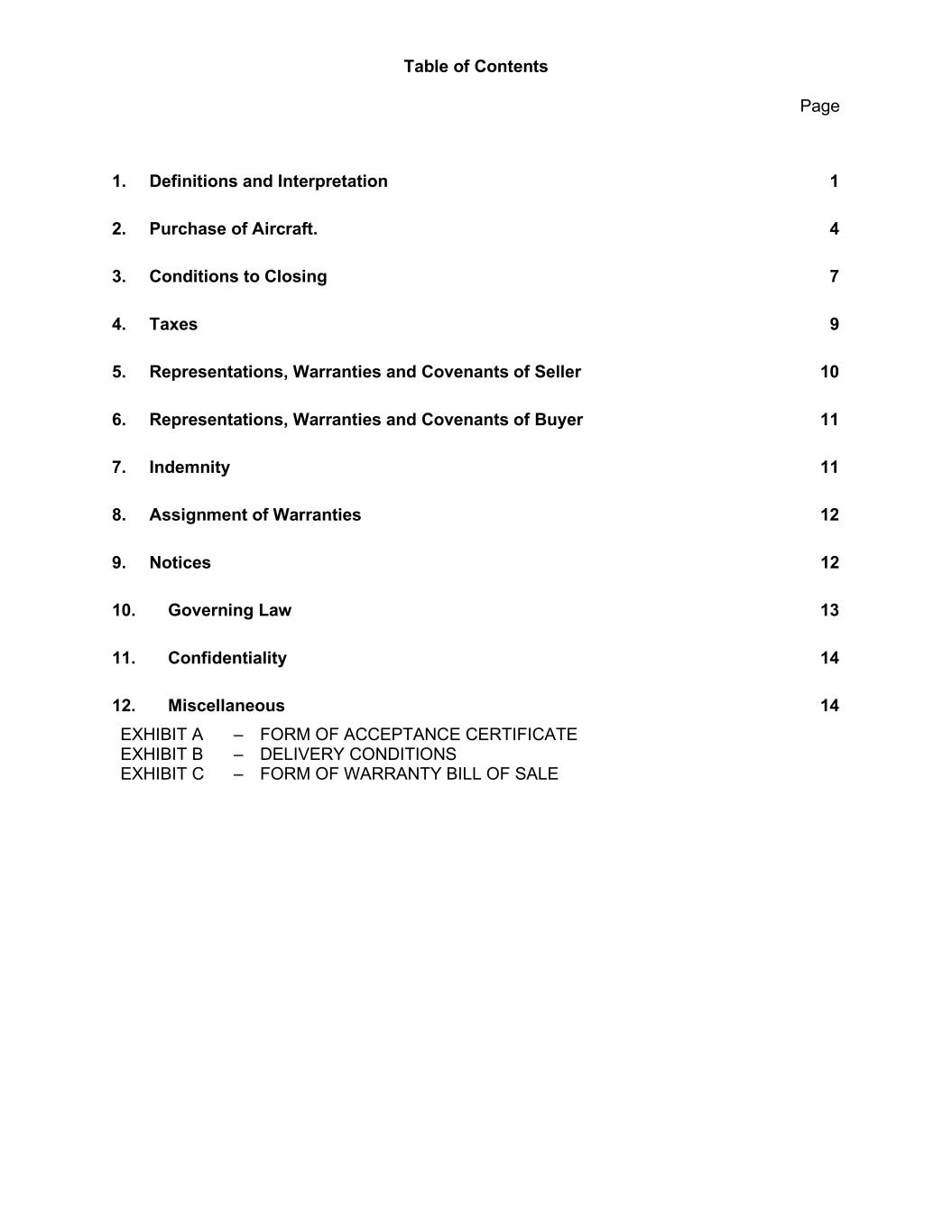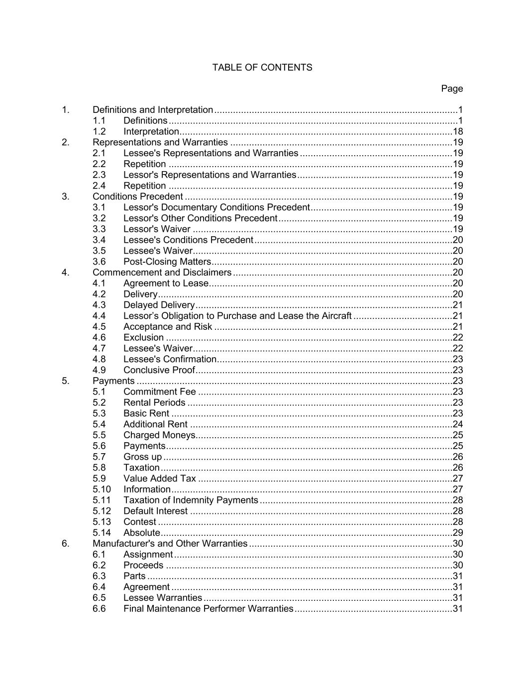 TABLE OF CONTENTS Page 1. Definitions and Interpretation ........................................................................................... 1 1.1 Definitions ............................................................................................................ 1 1.2 Interpretation ...................................................................................................... 18 2. Representations and Warranties ................................................................................... 19 2.1 Lessee's Representations and Warranties ......................................................... 19 2.2 Repetition .......................................................................................................... 19 2.3 Lessor's Representations and Warranties .......................................................... 19 2.4 Repetition .......................................................................................................... 19 3. Conditions Precedent .................................................................................................... 19 3.1 Lessor's Documentary Conditions Precedent ..................................................... 19 3.2 Lessor's Other Conditions Precedent ................................................................. 19 3.3 Lessor's Waiver ................................................................................................. 19 3.4 Lessee's Conditions Precedent .......................................................................... 20 3.5 Lessee's Waiver ................................................................................................. 20 3.6 Post-Closing Matters .......................................................................................... 20 4. Commencement and Disclaimers .................................................................................. 20 4.1 Agreement to Lease ........................................................................................... 20 4.2 Delivery .............................................................................................................. 20 4.3 Delayed Delivery ................................................................................................ 21 4.4 Lessor’s Obligation to Purchase and Lease the Aircraft ..................................... 21 4.5 Acceptance and Risk ......................................................................................... 21 4.6 Exclusion ........................................................................................................... 22 4.7 Lessee's Waiver ................................................................................................. 22 4.8 Lessee's Confirmation ........................................................................................ 23 4.9 Conclusive Proof ................................................................................................ 23 5. Payments ...................................................................................................................... 23 5.1 Commitment Fee ............................................................................................... 23 5.2 Rental Periods ................................................................................................... 23 5.3 Basic Rent ......................................................................................................... 23 5.4 Additional Rent .................................................................................................. 24 5.5 Charged Moneys................................................................................................ 25 5.6 Payments ........................................................................................................... 25 5.7 Gross up ............................................................................................................ 26 5.8 Taxation ............................................................................................................. 26 5.9 Value Added Tax ............................................................................................... 27 5.10 Information ......................................................................................................... 27 5.11 Taxation of Indemnity Payments ........................................................................ 28 5.12 Default Interest .................................................................................................. 28 5.13 Contest .............................................................................................................. 28 5.14 Absolute ............................................................................................................. 29 6. Manufacturer's and Other Warranties ............................................................................ 30 6.1 Assignment ........................................................................................................ 30 6.2 Proceeds ........................................................................................................... 30 6.3 Parts .................................................................................................................. 31 6.4 Agreement ......................................................................................................... 31 6.5 Lessee Warranties ............................................................................................. 31 6.6 Final Maintenance Performer Warranties ........................................................... 31