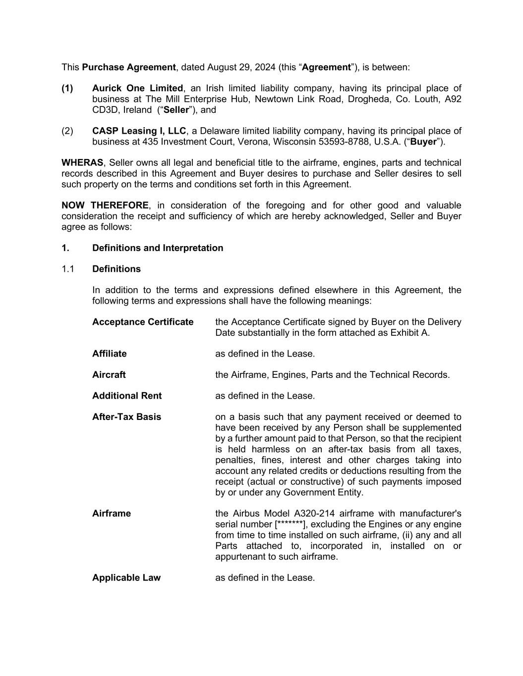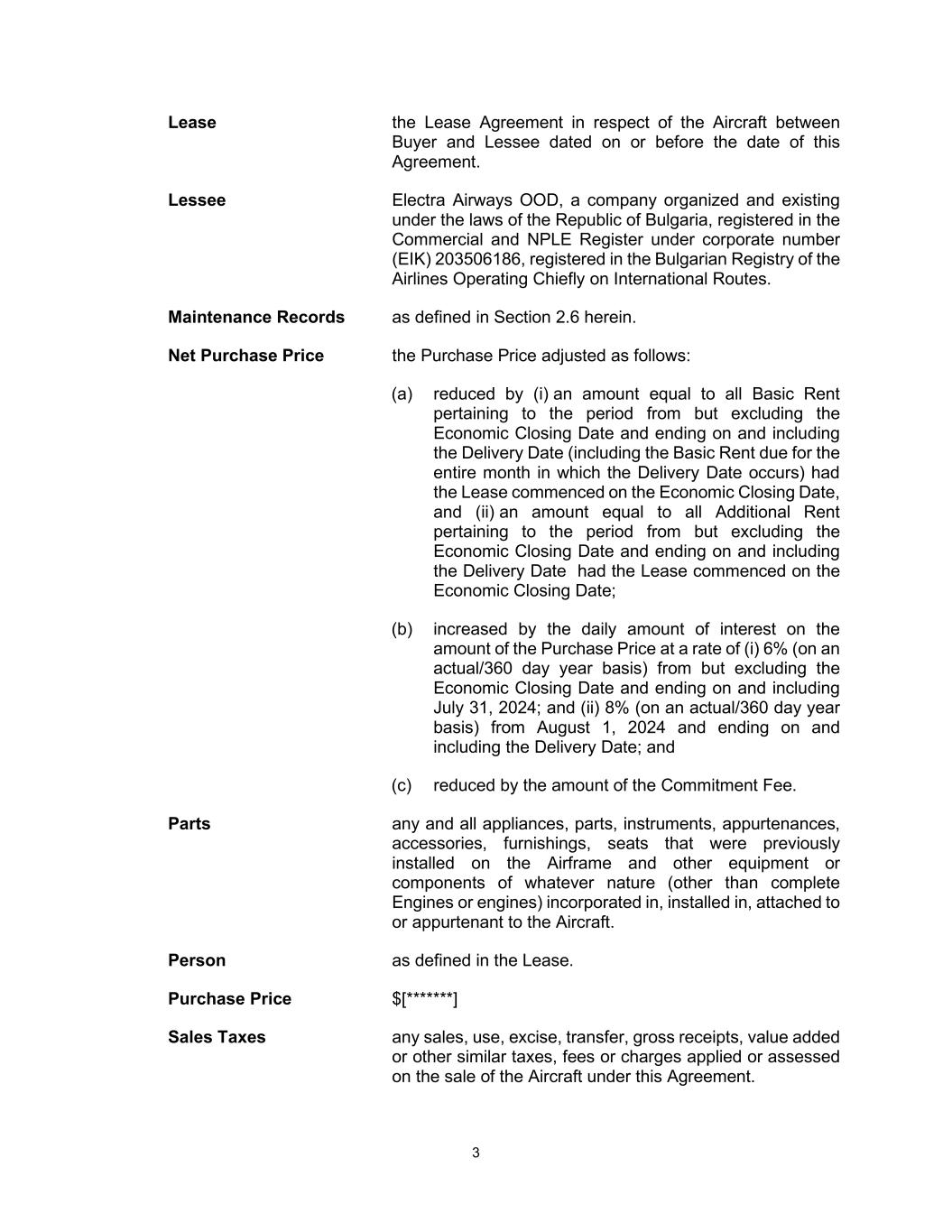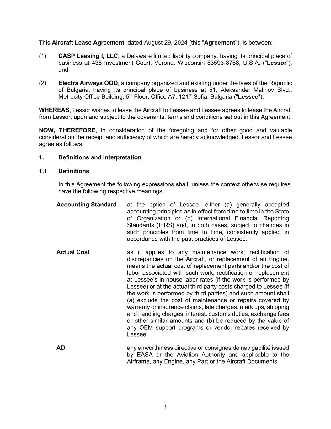 1 This Aircraft Lease Agreement, dated August 29, 2024 (this "Agreement"), is between: (1) CASP Leasing I, LLC, a Delaware limited liability company, having its principal place of business at 435 Investment Court, Verona, Wisconsin 53593-8788, U.S.A. ("Lessor"), and (2) Electra Airways OOD, a company organized and existing under the laws of the Republic of Bulgaria, having its principal place of business at 51, Aleksander Malinov Blvd., Metrocity Office Building, 5th Floor, Office A7, 1217 Sofia, Bulgaria ("Lessee"). WHEREAS, Lessor wishes to lease the Aircraft to Lessee and Lessee agrees to lease the Aircraft from Lessor, upon and subject to the covenants, terms and conditions set out in this Agreement. NOW, THEREFORE, in consideration of the foregoing and for other good and valuable consideration the receipt and sufficiency of which are hereby acknowledged, Lessor and Lessee agree as follows: 1. Definitions and Interpretation 1.1 Definitions In this Agreement the following expressions shall, unless the context otherwise requires, have the following respective meanings: Accounting Standard at the option of Lessee, either (a) generally accepted accounting principles as in effect from time to time in the State of Organization or (b) International Financial Reporting Standards (IFRS) and, in both cases, subject to changes in such principles from time to time, consistently applied in accordance with the past practices of Lessee. Actual Cost as it applies to any maintenance work, rectification of discrepancies on the Aircraft, or replacement of an Engine, means the actual cost of replacement parts and/or the cost of labor associated with such work, rectification or replacement at Lessee's in-house labor rates (if the work is performed by Lessee) or at the actual third party costs charged to Lessee (if the work is performed by third parties) and such amount shall (a) exclude the cost of maintenance or repairs covered by warranty or insurance claims, late charges, mark ups, shipping and handling charges, interest, customs duties, exchange fees or other similar amounts and (b) be reduced by the value of any OEM support programs or vendor rebates received by Lessee. AD any airworthiness directive or consignes de navigabilité issued by EASA or the Aviation Authority and applicable to the Airframe, any Engine, any Part or the Aircraft Documents.