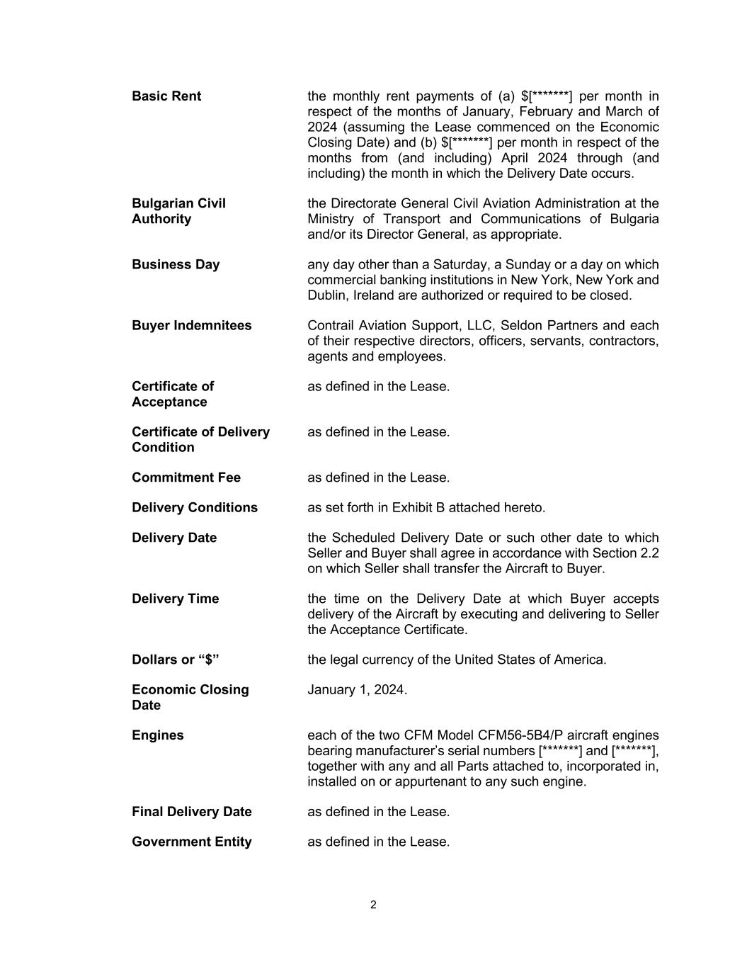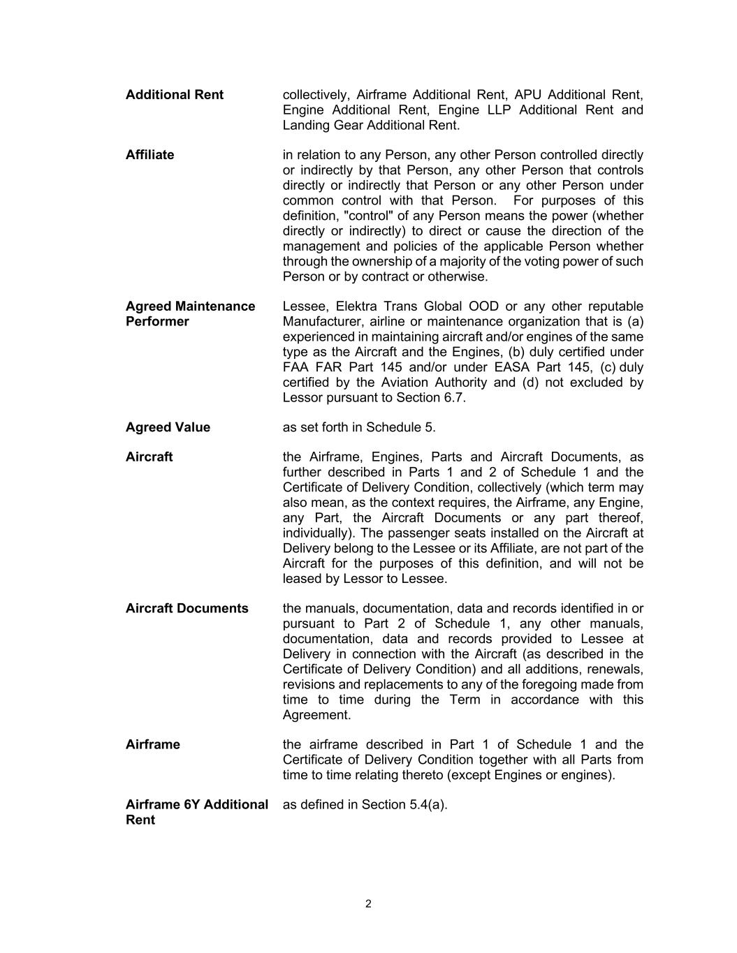 2 Additional Rent collectively, Airframe Additional Rent, APU Additional Rent, Engine Additional Rent, Engine LLP Additional Rent and Landing Gear Additional Rent. Affiliate in relation to any Person, any other Person controlled directly or indirectly by that Person, any other Person that controls directly or indirectly that Person or any other Person under common control with that Person. For purposes of this definition, "control" of any Person means the power (whether directly or indirectly) to direct or cause the direction of the management and policies of the applicable Person whether through the ownership of a majority of the voting power of such Person or by contract or otherwise. Agreed Maintenance Performer Lessee, Elektra Trans Global OOD or any other reputable Manufacturer, airline or maintenance organization that is (a) experienced in maintaining aircraft and/or engines of the same type as the Aircraft and the Engines, (b) duly certified under FAA FAR Part 145 and/or under EASA Part 145, (c) duly certified by the Aviation Authority and (d) not excluded by Lessor pursuant to Section 6.7. Agreed Value as set forth in Schedule 5. Aircraft the Airframe, Engines, Parts and Aircraft Documents, as further described in Parts 1 and 2 of Schedule 1 and the Certificate of Delivery Condition, collectively (which term may also mean, as the context requires, the Airframe, any Engine, any Part, the Aircraft Documents or any part thereof, individually). The passenger seats installed on the Aircraft at Delivery belong to the Lessee or its Affiliate, are not part of the Aircraft for the purposes of this definition, and will not be leased by Lessor to Lessee. Aircraft Documents the manuals, documentation, data and records identified in or pursuant to Part 2 of Schedule 1, any other manuals, documentation, data and records provided to Lessee at Delivery in connection with the Aircraft (as described in the Certificate of Delivery Condition) and all additions, renewals, revisions and replacements to any of the foregoing made from time to time during the Term in accordance with this Agreement. Airframe the airframe described in Part 1 of Schedule 1 and the Certificate of Delivery Condition together with all Parts from time to time relating thereto (except Engines or engines). Airframe 6Y Additional Rent as defined in Section 5.4(a).