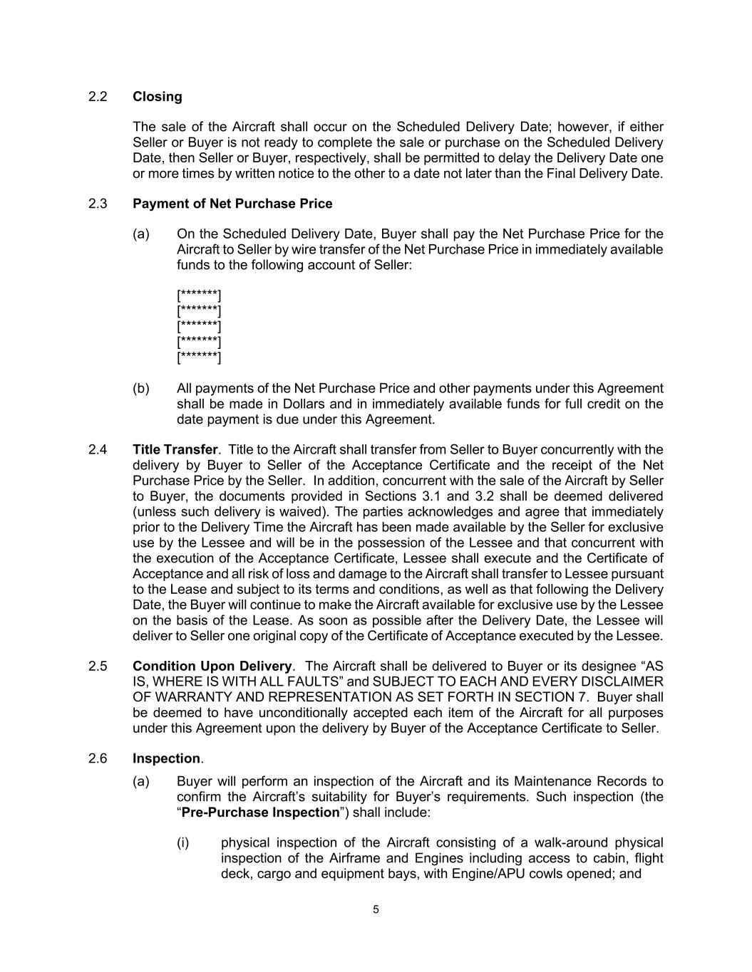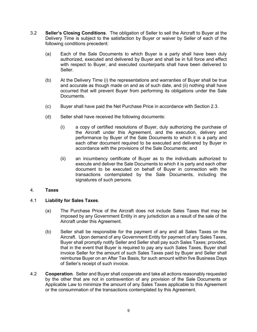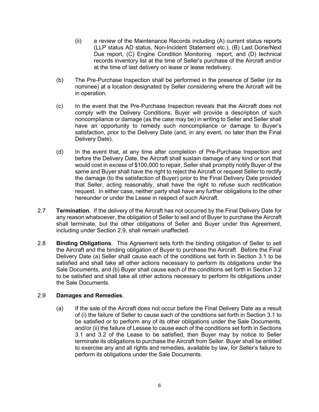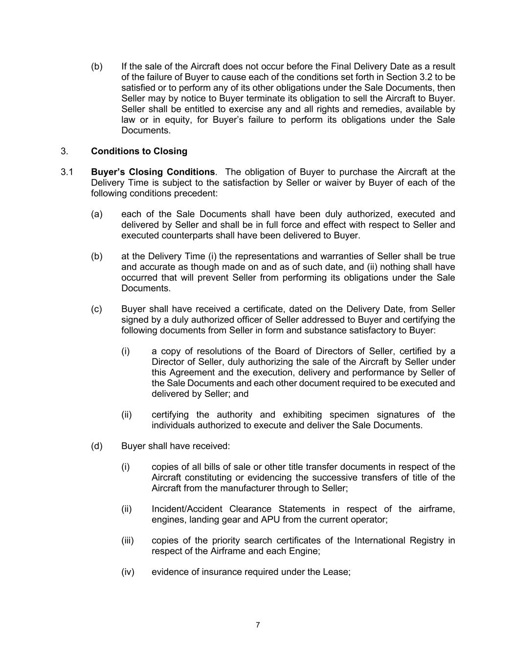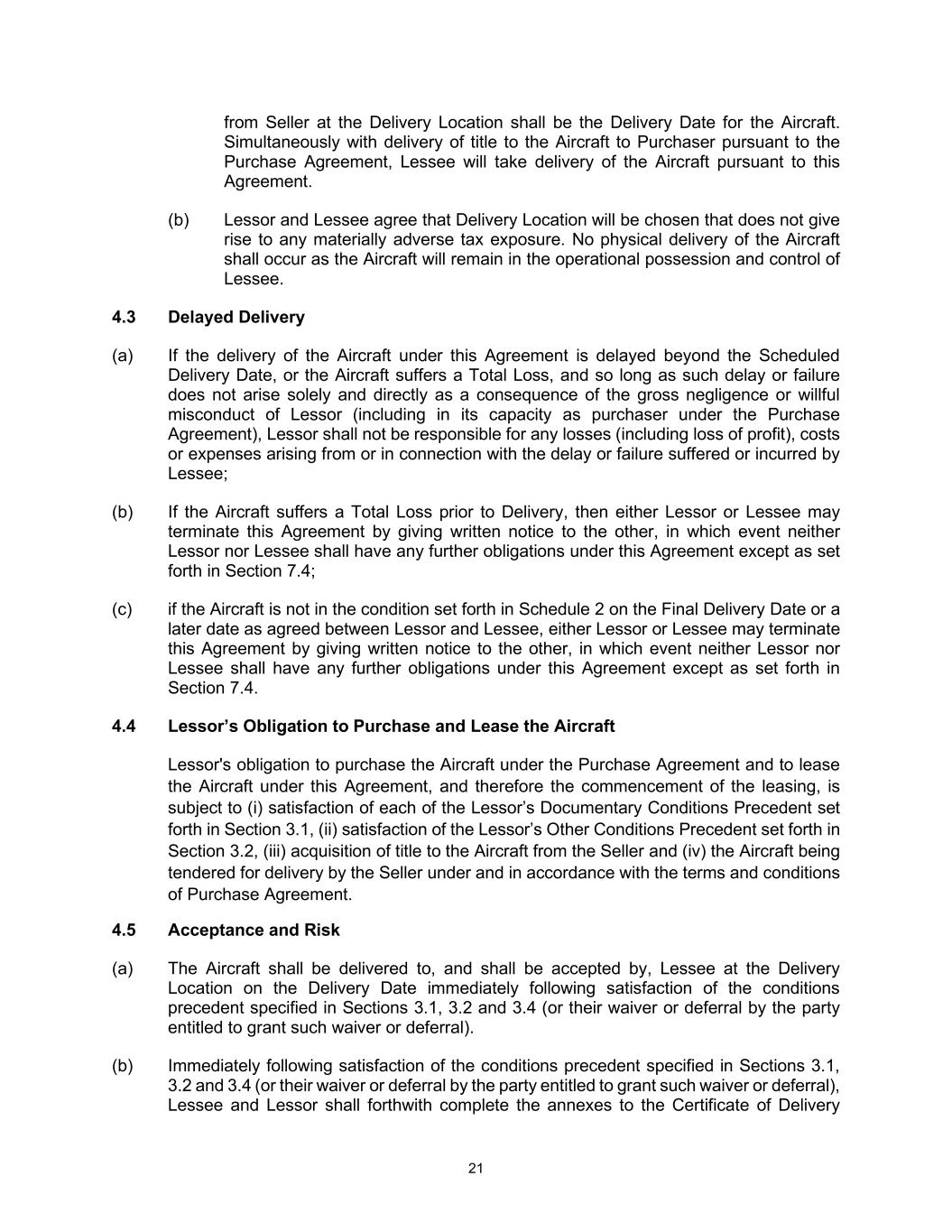 21 from Seller at the Delivery Location shall be the Delivery Date for the Aircraft. Simultaneously with delivery of title to the Aircraft to Purchaser pursuant to the Purchase Agreement, Lessee will take delivery of the Aircraft pursuant to this Agreement. (b) Lessor and Lessee agree that Delivery Location will be chosen that does not give rise to any materially adverse tax exposure. No physical delivery of the Aircraft shall occur as the Aircraft will remain in the operational possession and control of Lessee. 4.3 Delayed Delivery (a) If the delivery of the Aircraft under this Agreement is delayed beyond the Scheduled Delivery Date, or the Aircraft suffers a Total Loss, and so long as such delay or failure does not arise solely and directly as a consequence of the gross negligence or willful misconduct of Lessor (including in its capacity as purchaser under the Purchase Agreement), Lessor shall not be responsible for any losses (including loss of profit), costs or expenses arising from or in connection with the delay or failure suffered or incurred by Lessee; (b) If the Aircraft suffers a Total Loss prior to Delivery, then either Lessor or Lessee may terminate this Agreement by giving written notice to the other, in which event neither Lessor nor Lessee shall have any further obligations under this Agreement except as set forth in Section 7.4; (c) if the Aircraft is not in the condition set forth in Schedule 2 on the Final Delivery Date or a later date as agreed between Lessor and Lessee, either Lessor or Lessee may terminate this Agreement by giving written notice to the other, in which event neither Lessor nor Lessee shall have any further obligations under this Agreement except as set forth in Section 7.4. 4.4 Lessor’s Obligation to Purchase and Lease the Aircraft Lessor's obligation to purchase the Aircraft under the Purchase Agreement and to lease the Aircraft under this Agreement, and therefore the commencement of the leasing, is subject to (i) satisfaction of each of the Lessor’s Documentary Conditions Precedent set forth in Section 3.1, (ii) satisfaction of the Lessor’s Other Conditions Precedent set forth in Section 3.2, (iii) acquisition of title to the Aircraft from the Seller and (iv) the Aircraft being tendered for delivery by the Seller under and in accordance with the terms and conditions of Purchase Agreement. 4.5 Acceptance and Risk (a) The Aircraft shall be delivered to, and shall be accepted by, Lessee at the Delivery Location on the Delivery Date immediately following satisfaction of the conditions precedent specified in Sections 3.1, 3.2 and 3.4 (or their waiver or deferral by the party entitled to grant such waiver or deferral). (b) Immediately following satisfaction of the conditions precedent specified in Sections 3.1, 3.2 and 3.4 (or their waiver or deferral by the party entitled to grant such waiver or deferral), Lessee and Lessor shall forthwith complete the annexes to the Certificate of Delivery