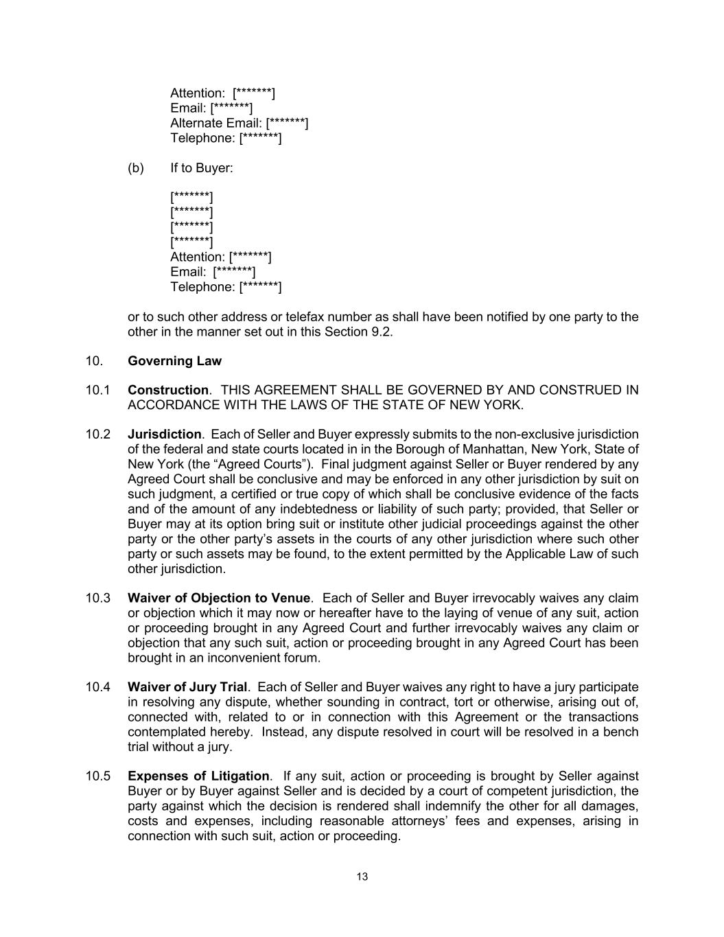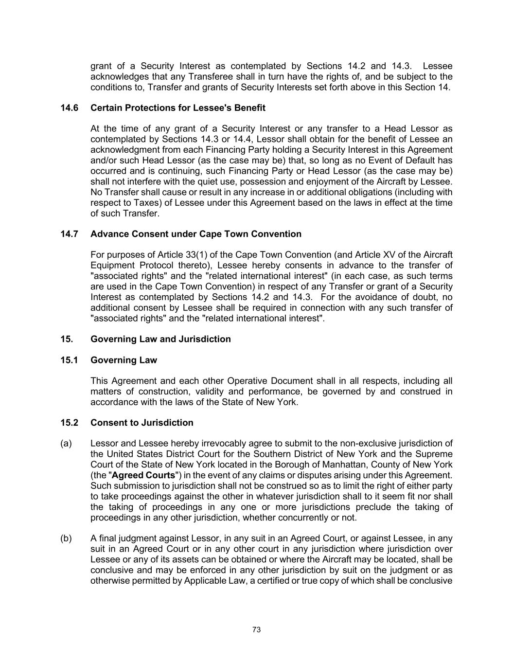 73 grant of a Security Interest as contemplated by Sections 14.2 and 14.3. Lessee acknowledges that any Transferee shall in turn have the rights of, and be subject to the conditions to, Transfer and grants of Security Interests set forth above in this Section 14. 14.6 Certain Protections for Lessee's Benefit At the time of any grant of a Security Interest or any transfer to a Head Lessor as contemplated by Sections 14.3 or 14.4, Lessor shall obtain for the benefit of Lessee an acknowledgment from each Financing Party holding a Security Interest in this Agreement and/or such Head Lessor (as the case may be) that, so long as no Event of Default has occurred and is continuing, such Financing Party or Head Lessor (as the case may be) shall not interfere with the quiet use, possession and enjoyment of the Aircraft by Lessee. No Transfer shall cause or result in any increase in or additional obligations (including with respect to Taxes) of Lessee under this Agreement based on the laws in effect at the time of such Transfer. 14.7 Advance Consent under Cape Town Convention For purposes of Article 33(1) of the Cape Town Convention (and Article XV of the Aircraft Equipment Protocol thereto), Lessee hereby consents in advance to the transfer of "associated rights" and the "related international interest" (in each case, as such terms are used in the Cape Town Convention) in respect of any Transfer or grant of a Security Interest as contemplated by Sections 14.2 and 14.3. For the avoidance of doubt, no additional consent by Lessee shall be required in connection with any such transfer of "associated rights" and the "related international interest". 15. Governing Law and Jurisdiction 15.1 Governing Law This Agreement and each other Operative Document shall in all respects, including all matters of construction, validity and performance, be governed by and construed in accordance with the laws of the State of New York. 15.2 Consent to Jurisdiction (a) Lessor and Lessee hereby irrevocably agree to submit to the non-exclusive jurisdiction of the United States District Court for the Southern District of New York and the Supreme Court of the State of New York located in the Borough of Manhattan, County of New York (the "Agreed Courts") in the event of any claims or disputes arising under this Agreement. Such submission to jurisdiction shall not be construed so as to limit the right of either party to take proceedings against the other in whatever jurisdiction shall to it seem fit nor shall the taking of proceedings in any one or more jurisdictions preclude the taking of proceedings in any other jurisdiction, whether concurrently or not. (b) A final judgment against Lessor, in any suit in an Agreed Court, or against Lessee, in any suit in an Agreed Court or in any other court in any jurisdiction where jurisdiction over Lessee or any of its assets can be obtained or where the Aircraft may be located, shall be conclusive and may be enforced in any other jurisdiction by suit on the judgment or as otherwise permitted by Applicable Law, a certified or true copy of which shall be conclusive