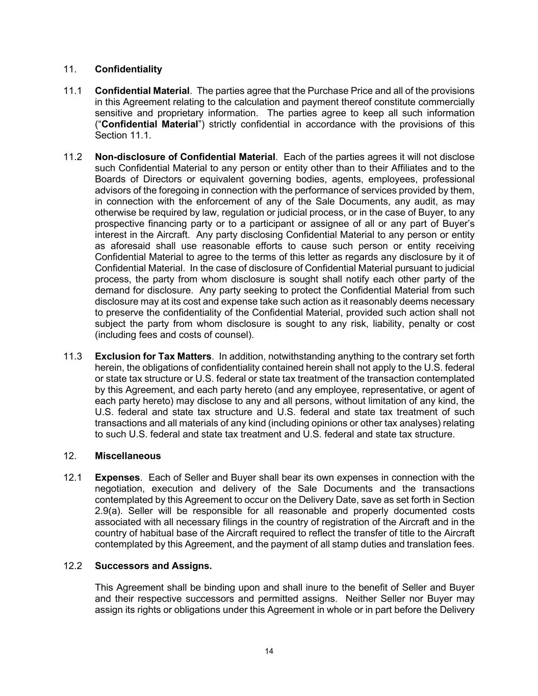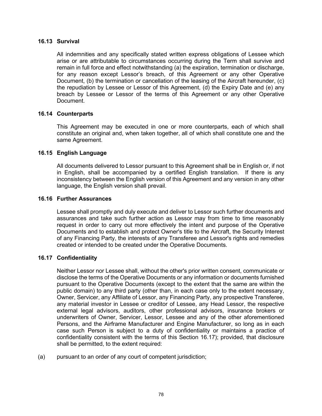 78 16.13 Survival All indemnities and any specifically stated written express obligations of Lessee which arise or are attributable to circumstances occurring during the Term shall survive and remain in full force and effect notwithstanding (a) the expiration, termination or discharge, for any reason except Lessor’s breach, of this Agreement or any other Operative Document, (b) the termination or cancellation of the leasing of the Aircraft hereunder, (c) the repudiation by Lessee or Lessor of this Agreement, (d) the Expiry Date and (e) any breach by Lessee or Lessor of the terms of this Agreement or any other Operative Document. 16.14 Counterparts This Agreement may be executed in one or more counterparts, each of which shall constitute an original and, when taken together, all of which shall constitute one and the same Agreement. 16.15 English Language All documents delivered to Lessor pursuant to this Agreement shall be in English or, if not in English, shall be accompanied by a certified English translation. If there is any inconsistency between the English version of this Agreement and any version in any other language, the English version shall prevail. 16.16 Further Assurances Lessee shall promptly and duly execute and deliver to Lessor such further documents and assurances and take such further action as Lessor may from time to time reasonably request in order to carry out more effectively the intent and purpose of the Operative Documents and to establish and protect Owner's title to the Aircraft, the Security Interest of any Financing Party, the interests of any Transferee and Lessor's rights and remedies created or intended to be created under the Operative Documents. 16.17 Confidentiality Neither Lessor nor Lessee shall, without the other's prior written consent, communicate or disclose the terms of the Operative Documents or any information or documents furnished pursuant to the Operative Documents (except to the extent that the same are within the public domain) to any third party (other than, in each case only to the extent necessary, Owner, Servicer, any Affiliate of Lessor, any Financing Party, any prospective Transferee, any material investor in Lessee or creditor of Lessee, any Head Lessor, the respective external legal advisors, auditors, other professional advisors, insurance brokers or underwriters of Owner, Servicer, Lessor, Lessee and any of the other aforementioned Persons, and the Airframe Manufacturer and Engine Manufacturer, so long as in each case such Person is subject to a duty of confidentiality or maintains a practice of confidentiality consistent with the terms of this Section 16.17); provided, that disclosure shall be permitted, to the extent required: (a) pursuant to an order of any court of competent jurisdiction;