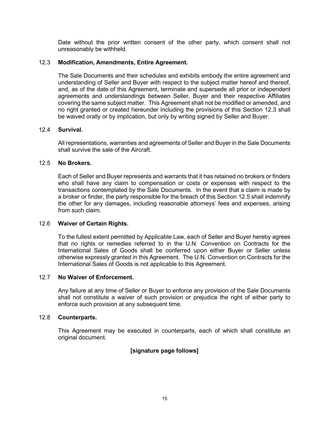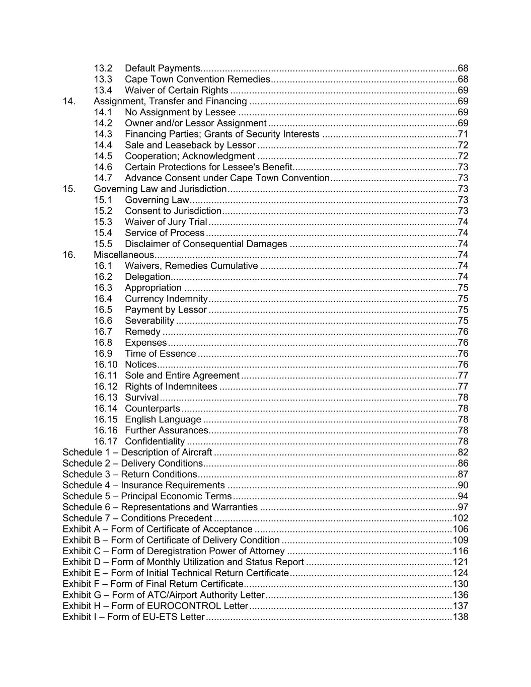 13.2 Default Payments............................................................................................... 68 13.3 Cape Town Convention Remedies ..................................................................... 68 13.4 Waiver of Certain Rights .................................................................................... 69 14. Assignment, Transfer and Financing ............................................................................. 69 14.1 No Assignment by Lessee ................................................................................. 69 14.2 Owner and/or Lessor Assignment ...................................................................... 69 14.3 Financing Parties; Grants of Security Interests .................................................. 71 14.4 Sale and Leaseback by Lessor .......................................................................... 72 14.5 Cooperation; Acknowledgment .......................................................................... 72 14.6 Certain Protections for Lessee's Benefit ............................................................. 73 14.7 Advance Consent under Cape Town Convention ............................................... 73 15. Governing Law and Jurisdiction ..................................................................................... 73 15.1 Governing Law ................................................................................................... 73 15.2 Consent to Jurisdiction ....................................................................................... 73 15.3 Waiver of Jury Trial ............................................................................................ 74 15.4 Service of Process ............................................................................................. 74 15.5 Disclaimer of Consequential Damages .............................................................. 74 16. Miscellaneous ................................................................................................................ 74 16.1 Waivers, Remedies Cumulative ......................................................................... 74 16.2 Delegation.......................................................................................................... 74 16.3 Appropriation ..................................................................................................... 75 16.4 Currency Indemnity ............................................................................................ 75 16.5 Payment by Lessor ............................................................................................ 75 16.6 Severability ........................................................................................................ 75 16.7 Remedy ............................................................................................................. 76 16.8 Expenses ........................................................................................................... 76 16.9 Time of Essence ................................................................................................ 76 16.10 Notices ............................................................................................................... 76 16.11 Sole and Entire Agreement ................................................................................ 77 16.12 Rights of Indemnitees ........................................................................................ 77 16.13 Survival .............................................................................................................. 78 16.14 Counterparts ...................................................................................................... 78 16.15 English Language .............................................................................................. 78 16.16 Further Assurances ............................................................................................ 78 16.17 Confidentiality .................................................................................................... 78 Schedule 1 – Description of Aircraft .......................................................................................... 82 Schedule 2 – Delivery Conditions.............................................................................................. 86 Schedule 3 – Return Conditions ................................................................................................ 87 Schedule 4 – Insurance Requirements ..................................................................................... 90 Schedule 5 – Principal Economic Terms ................................................................................... 94 Schedule 6 – Representations and Warranties ......................................................................... 97 Schedule 7 – Conditions Precedent ........................................................................................ 102 Exhibit A – Form of Certificate of Acceptance ......................................................................... 106 Exhibit B – Form of Certificate of Delivery Condition ............................................................... 109 Exhibit C – Form of Deregistration Power of Attorney ............................................................. 116 Exhibit D – Form of Monthly Utilization and Status Report ...................................................... 121 Exhibit E – Form of Initial Technical Return Certificate ............................................................ 124 Exhibit F – Form of Final Return Certificate ............................................................................. 130 Exhibit G – Form of ATC/Airport Authority Letter ..................................................................... 136 Exhibit H – Form of EUROCONTROL Letter ........................