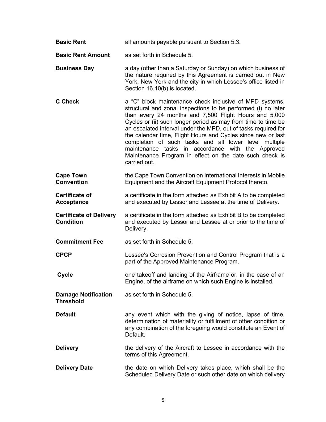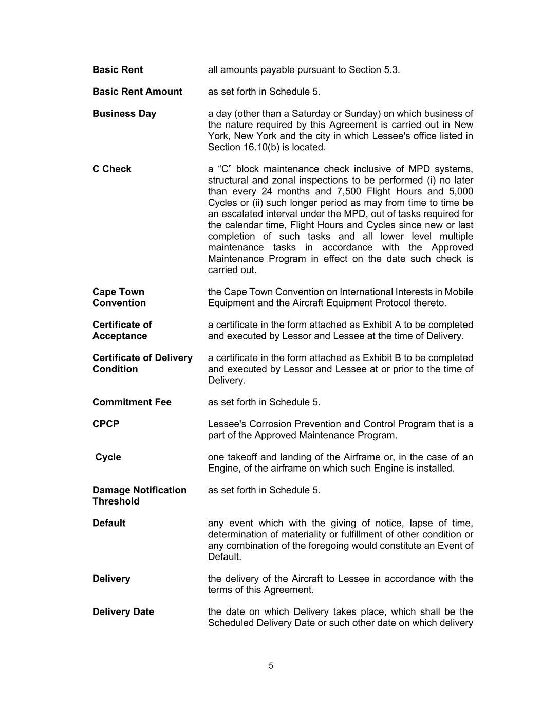 5 Basic Rent all amounts payable pursuant to Section 5.3. Basic Rent Amount as set forth in Schedule 5. Business Day a day (other than a Saturday or Sunday) on which business of the nature required by this Agreement is carried out in New York, New York and the city in which Lessee's office listed in Section 16.10(b) is located. C Check a “C” block maintenance check inclusive of MPD systems, structural and zonal inspections to be performed (i) no later than every 24 months and 7,500 Flight Hours and 5,000 Cycles or (ii) such longer period as may from time to time be an escalated interval under the MPD, out of tasks required for the calendar time, Flight Hours and Cycles since new or last completion of such tasks and all lower level multiple maintenance tasks in accordance with the Approved Maintenance Program in effect on the date such check is carried out. Cape Town Convention the Cape Town Convention on International Interests in Mobile Equipment and the Aircraft Equipment Protocol thereto. Certificate of Acceptance a certificate in the form attached as Exhibit A to be completed and executed by Lessor and Lessee at the time of Delivery. Certificate of Delivery Condition a certificate in the form attached as Exhibit B to be completed and executed by Lessor and Lessee at or prior to the time of Delivery. Commitment Fee as set forth in Schedule 5. CPCP Lessee's Corrosion Prevention and Control Program that is a part of the Approved Maintenance Program. Cycle one takeoff and landing of the Airframe or, in the case of an Engine, of the airframe on which such Engine is installed. Damage Notification Threshold as set forth in Schedule 5. Default any event which with the giving of notice, lapse of time, determination of materiality or fulfillment of other condition or any combination of the foregoing would constitute an Event of Default. Delivery the delivery of the Aircraft to Lessee in accordance with the terms of this Agreement. Delivery Date the date on which Delivery takes place, which shall be the Scheduled Delivery Date or such other date on which delivery