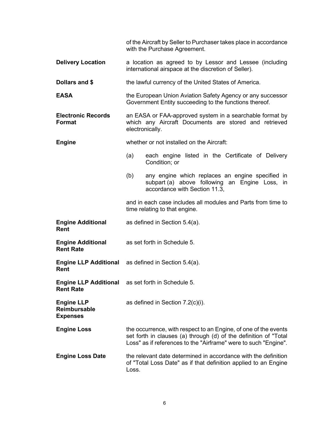 6 of the Aircraft by Seller to Purchaser takes place in accordance with the Purchase Agreement. Delivery Location a location as agreed to by Lessor and Lessee (including international airspace at the discretion of Seller). Dollars and $ the lawful currency of the United States of America. EASA the European Union Aviation Safety Agency or any successor Government Entity succeeding to the functions thereof. Electronic Records Format an EASA or FAA-approved system in a searchable format by which any Aircraft Documents are stored and retrieved electronically. Engine whether or not installed on the Aircraft: (a) each engine listed in the Certificate of Delivery Condition; or (b) any engine which replaces an engine specified in subpart (a) above following an Engine Loss, in accordance with Section 11.3, and in each case includes all modules and Parts from time to time relating to that engine. Engine Additional Rent as defined in Section 5.4(a). Engine Additional Rent Rate as set forth in Schedule 5. Engine LLP Additional Rent as defined in Section 5.4(a). Engine LLP Additional Rent Rate as set forth in Schedule 5. Engine LLP Reimbursable Expenses as defined in Section 7.2(c)(i). Engine Loss the occurrence, with respect to an Engine, of one of the events set forth in clauses (a) through (d) of the definition of "Total Loss" as if references to the "Airframe" were to such "Engine". Engine Loss Date the relevant date determined in accordance with the definition of "Total Loss Date" as if that definition applied to an Engine Loss.
