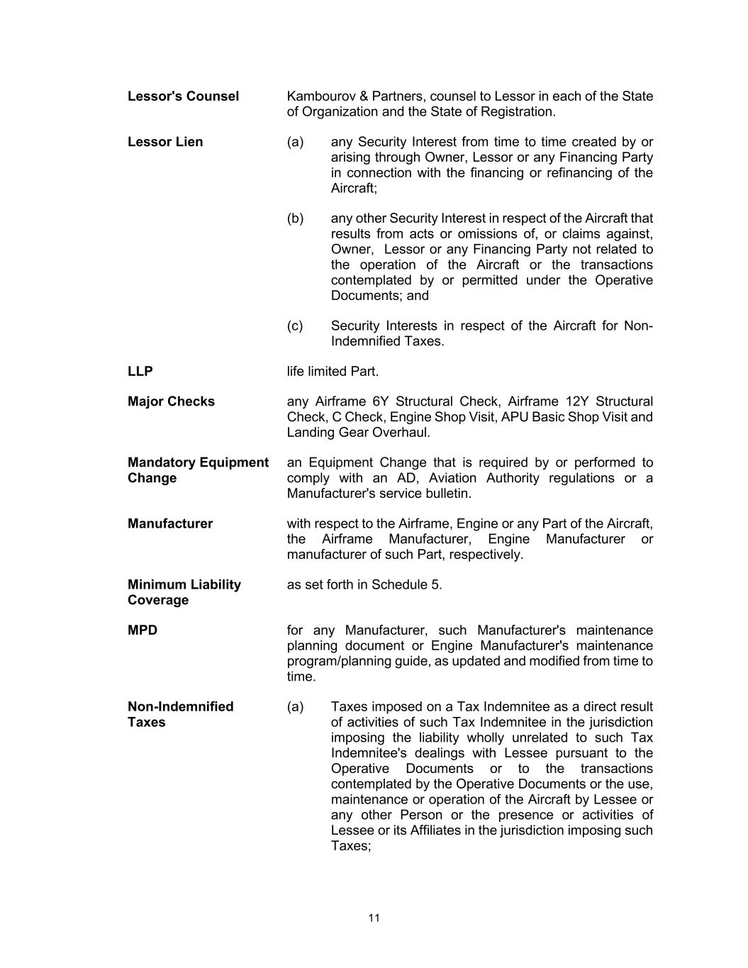 11 Lessor's Counsel Kambourov & Partners, counsel to Lessor in each of the State of Organization and the State of Registration. Lessor Lien (a) any Security Interest from time to time created by or arising through Owner, Lessor or any Financing Party in connection with the financing or refinancing of the Aircraft; (b) any other Security Interest in respect of the Aircraft that results from acts or omissions of, or claims against, Owner, Lessor or any Financing Party not related to the operation of the Aircraft or the transactions contemplated by or permitted under the Operative Documents; and (c) Security Interests in respect of the Aircraft for Non- Indemnified Taxes. LLP life limited Part. Major Checks any Airframe 6Y Structural Check, Airframe 12Y Structural Check, C Check, Engine Shop Visit, APU Basic Shop Visit and Landing Gear Overhaul. Mandatory Equipment Change an Equipment Change that is required by or performed to comply with an AD, Aviation Authority regulations or a Manufacturer's service bulletin. Manufacturer with respect to the Airframe, Engine or any Part of the Aircraft, the Airframe Manufacturer, Engine Manufacturer or manufacturer of such Part, respectively. Minimum Liability Coverage as set forth in Schedule 5. MPD for any Manufacturer, such Manufacturer's maintenance planning document or Engine Manufacturer's maintenance program/planning guide, as updated and modified from time to time. Non-Indemnified Taxes (a) Taxes imposed on a Tax Indemnitee as a direct result of activities of such Tax Indemnitee in the jurisdiction imposing the liability wholly unrelated to such Tax Indemnitee's dealings with Lessee pursuant to the Operative Documents or to the transactions contemplated by the Operative Documents or the use, maintenance or operation of the Aircraft by Lessee or any other Person or the presence or activities of Lessee or its Affiliates in the jurisdiction imposing such Taxes;